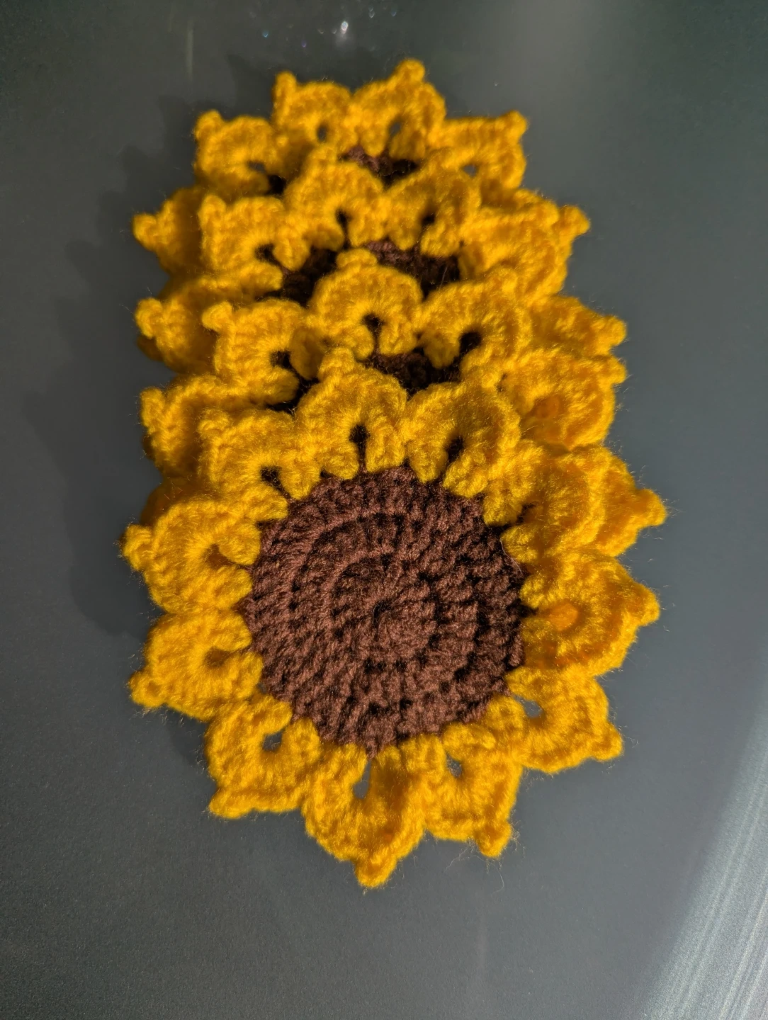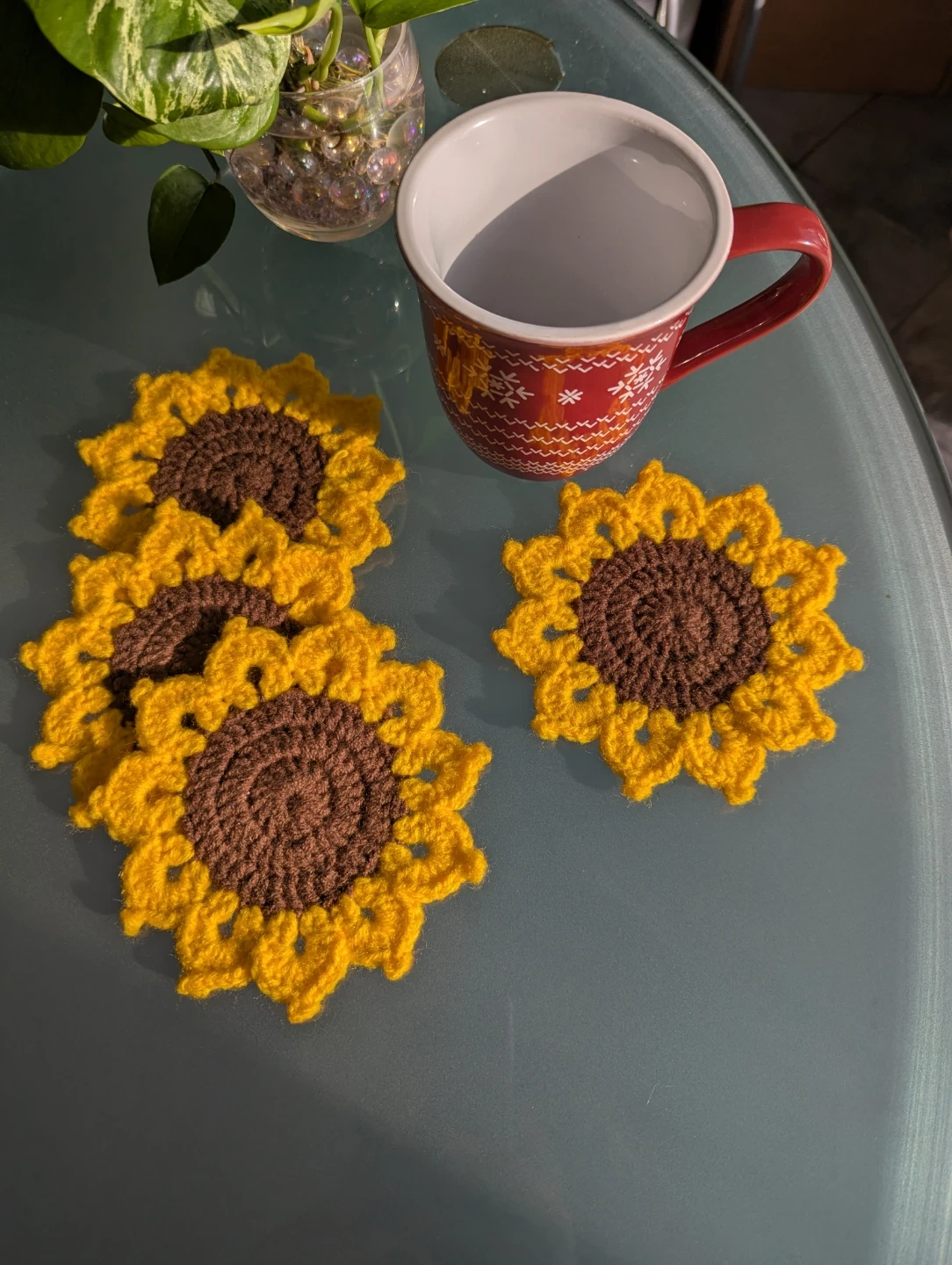 These adorable handmade sunflower coasters will add a touch of sunshine to your home! This set includes four coasters, perfect for protecting your surfaces from hot or cold drinks. They're made with love and care, and are sure to brighten up any room!