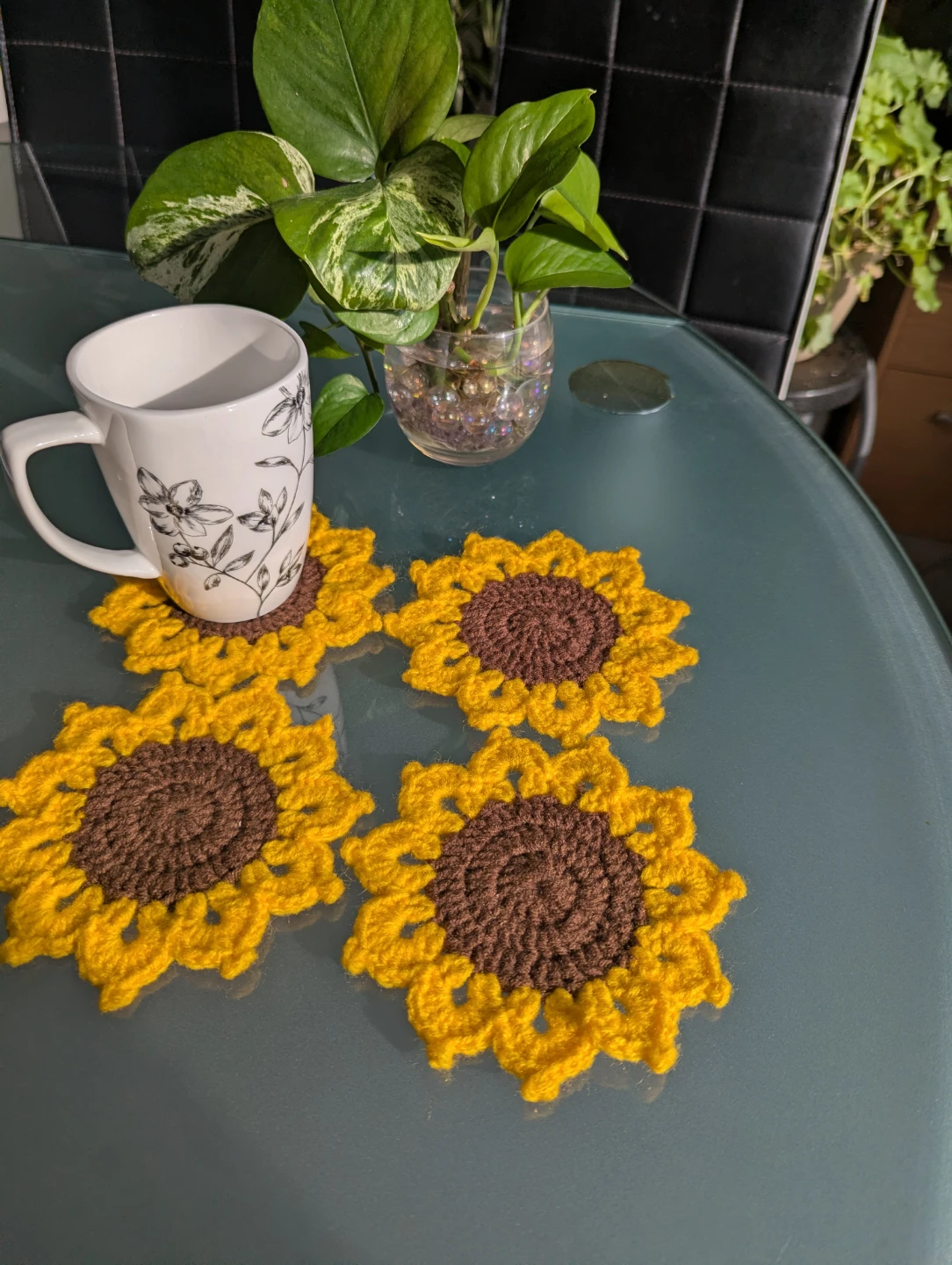 These adorable handmade sunflower coasters will add a touch of sunshine to your home! This set includes four coasters, perfect for protecting your surfaces from hot or cold drinks. They're made with love and care, and are sure to brighten up any room!