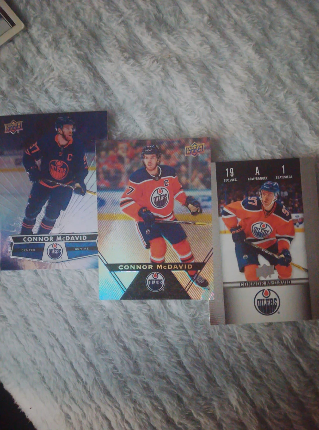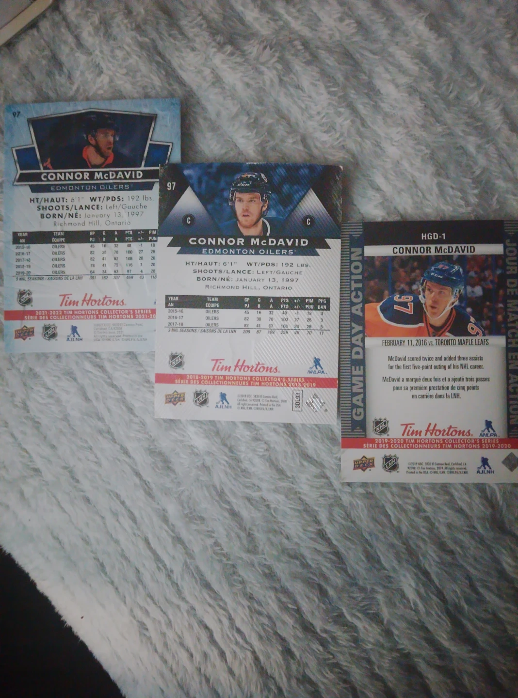 Three Upper Deck hockey cards featuring Connor McDavid of the Edmonton Oilers. Includes collector series cards from Tim Hortons. Great for any hockey fan's collection!