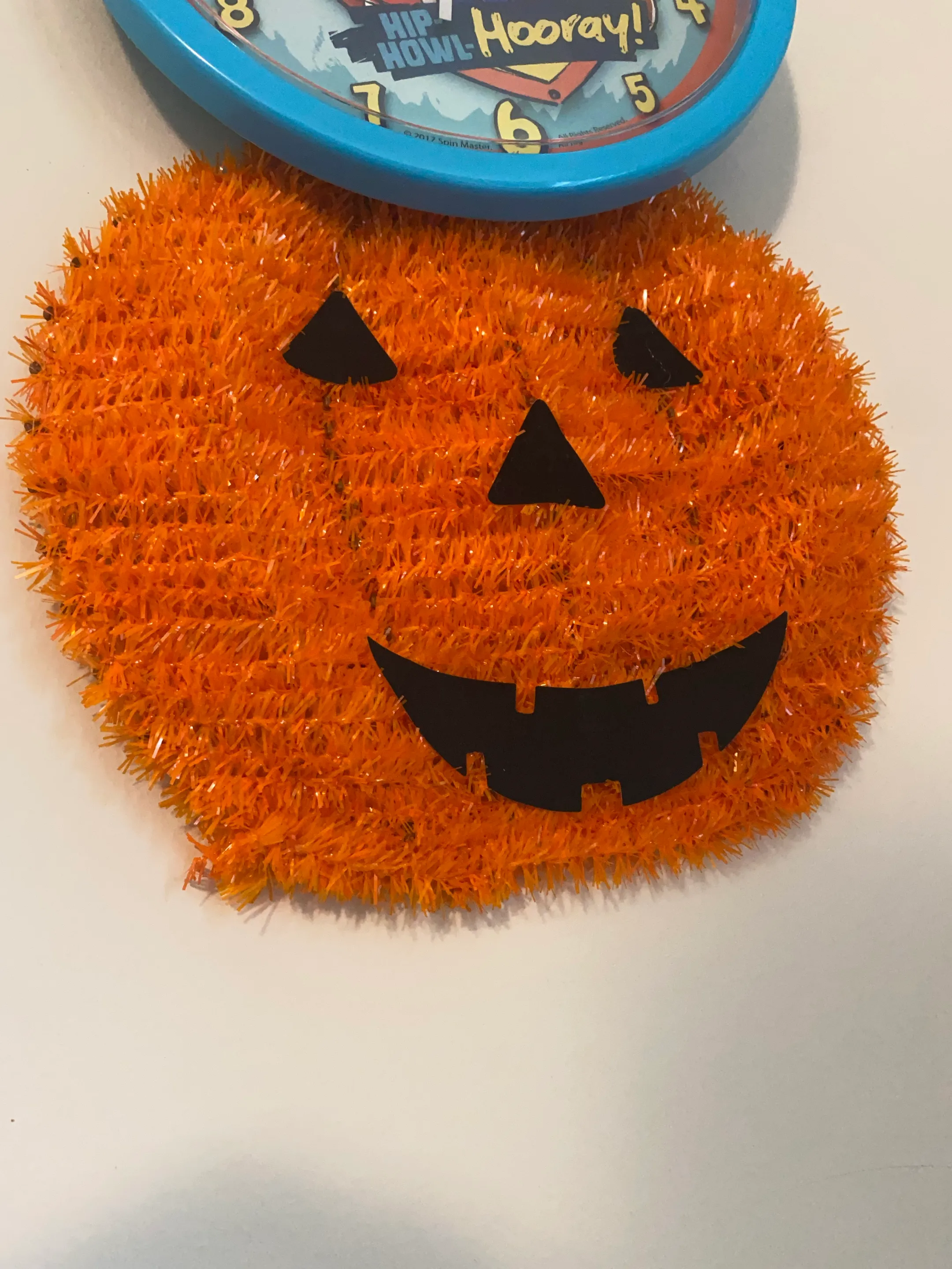 Bright orange tinsel pumpkin decoration with black felt face. Perfect for seasonal decorating during Halloween! It's a fun addition to your festive decor. Negotiable.