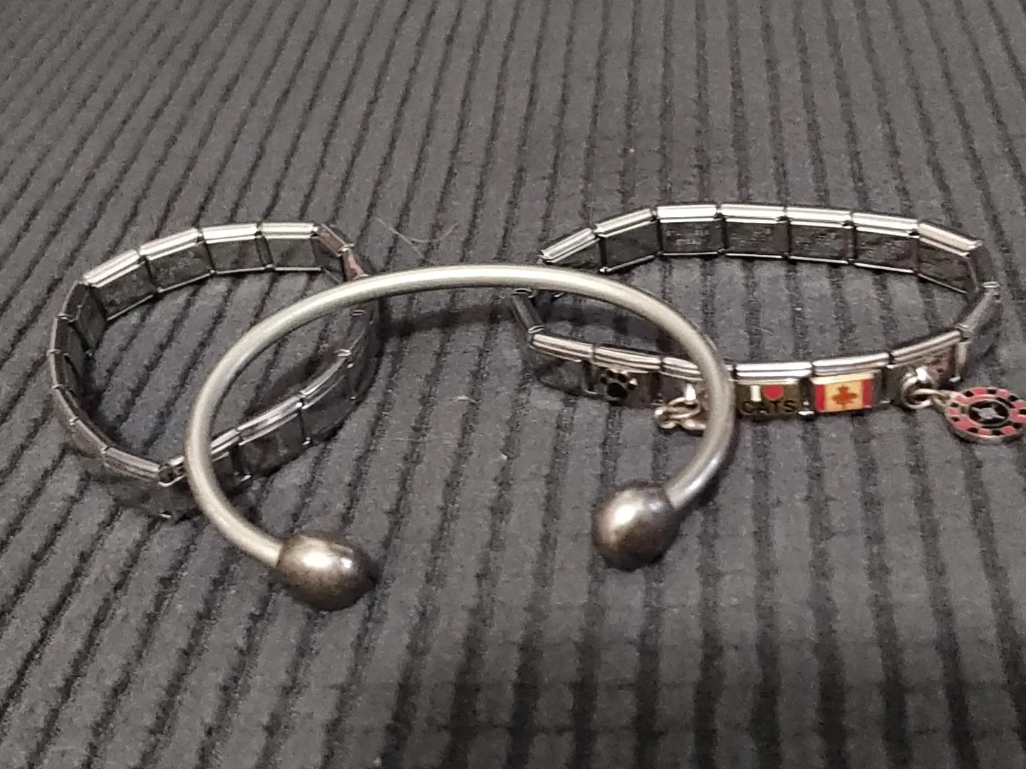 This listing includes two charm bracelets. One is a silver-tone expandable bracelet with various charms, including a Canadian flag, paw prints, and the word 'CATS'. The other is a simple silver-tone open cuff bracelet with decorative bulb ends. They're a fun way to show off your interests!