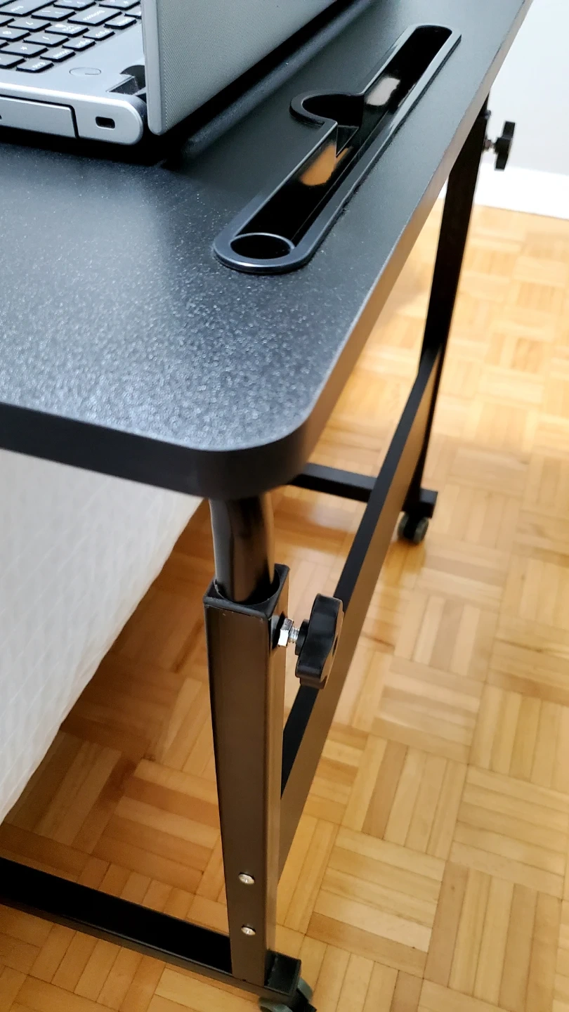 This portable desk is new and comes in a box, but assembling shouldn't take much effort. The height is adjustable, the wheels are lockable. Please don't ask for lower price (orig is $138 inc. tax), so save $$.