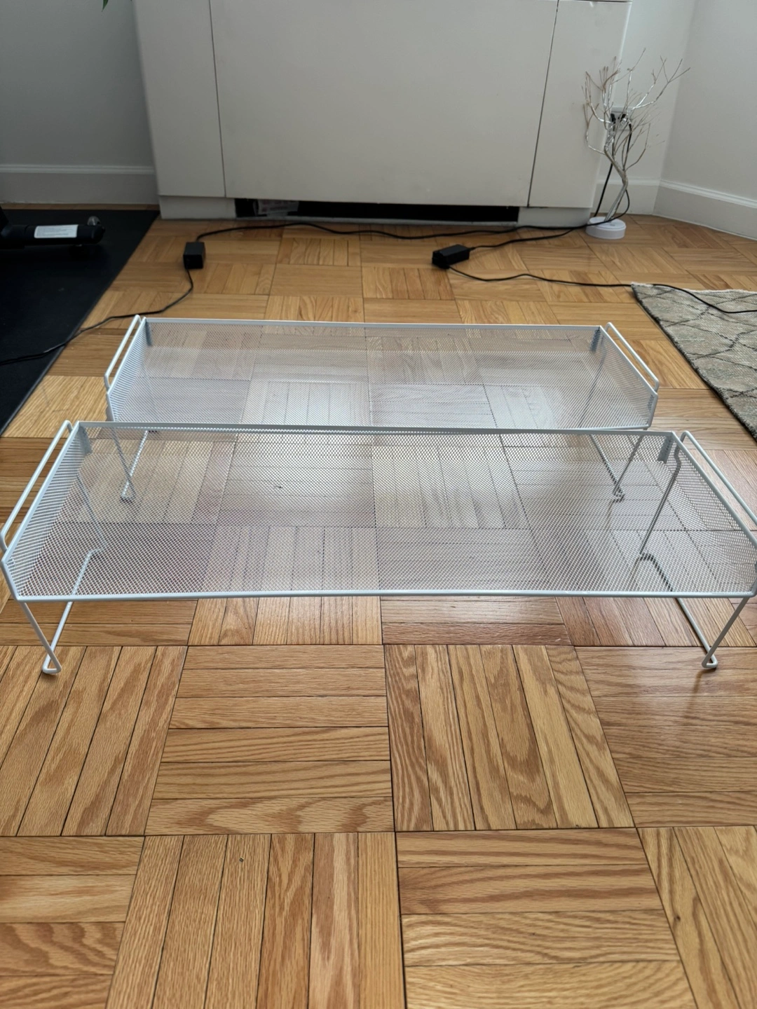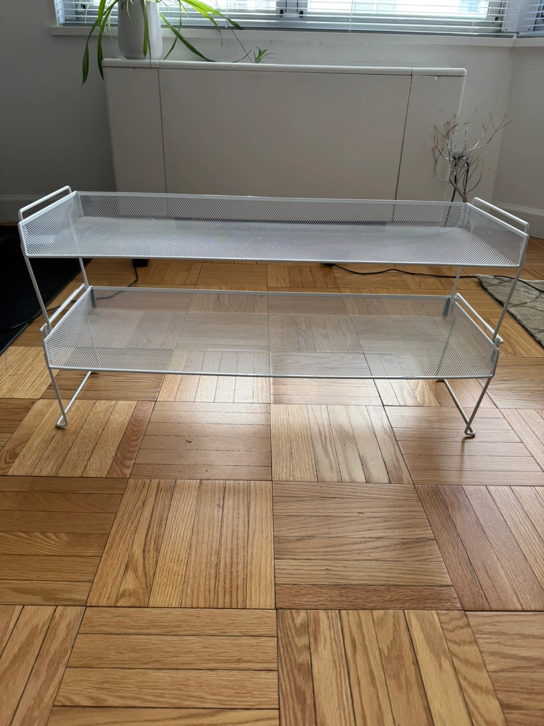 Two-tiered shelf organizer. Metal wire construction. White finish. Great for shoe storage. Compact size.