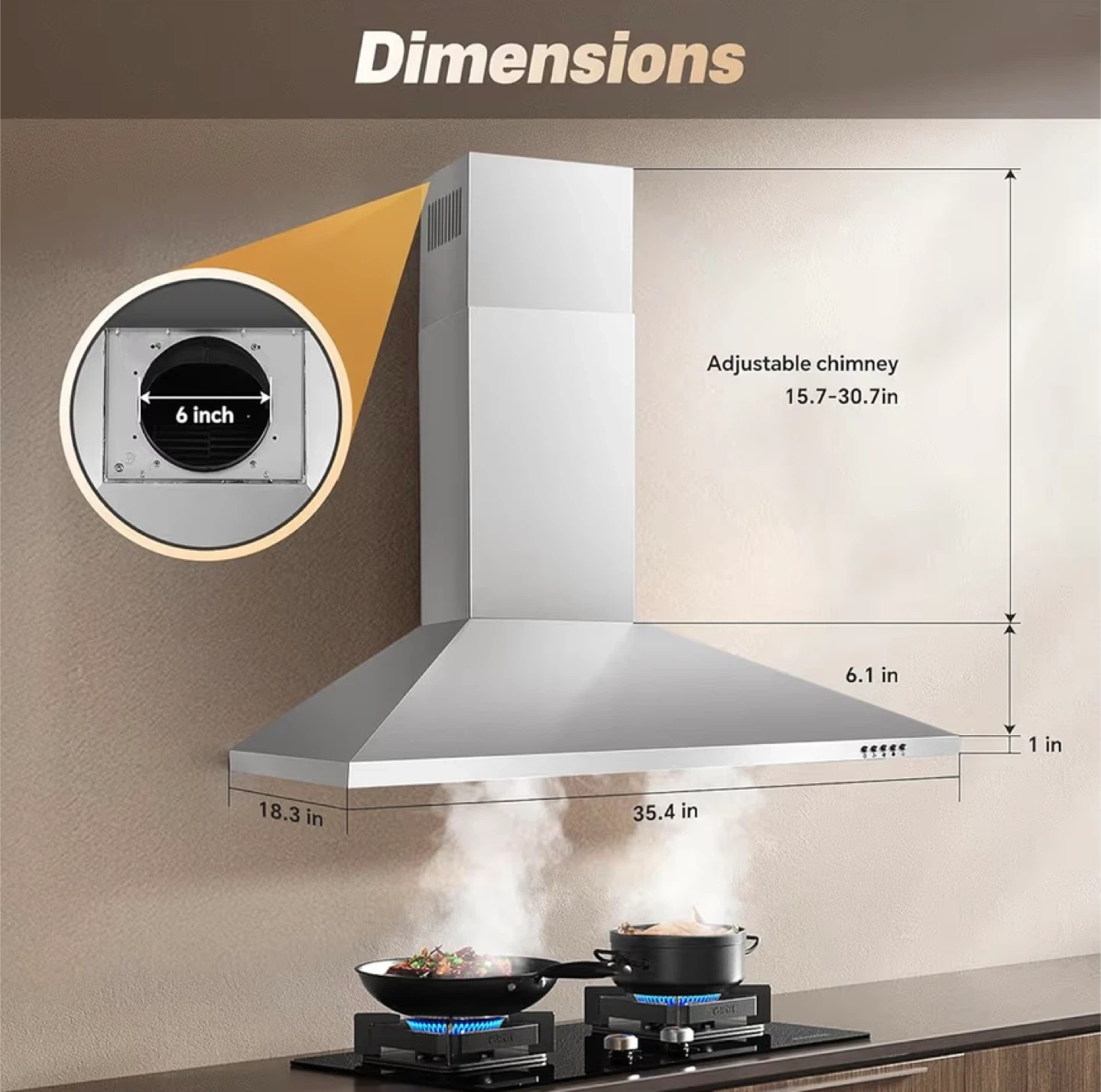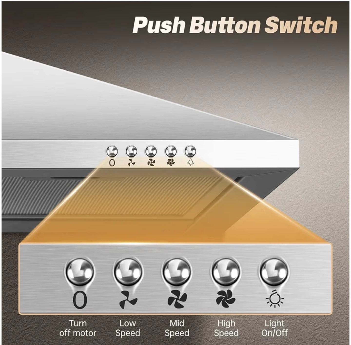 This stainless steel range hood offers 3 speeds with a maximum of 450 CFM suction. It features push-button controls for fan speed and lighting. The adjustable chimney extends from 15.7 to 30.7 inches. It's a useful addition to any kitchen!
