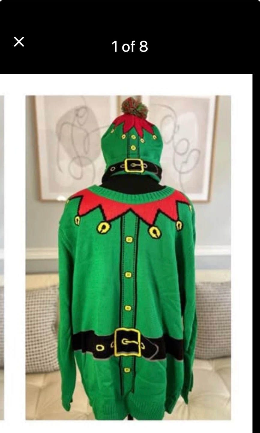 Get ready for the holidays with this fun elf costume sweater and matching hat! It's perfect for Christmas parties or just spreading some festive cheer! The sweater features a cute elf design with bells and a belt buckle, and the hat completes the look