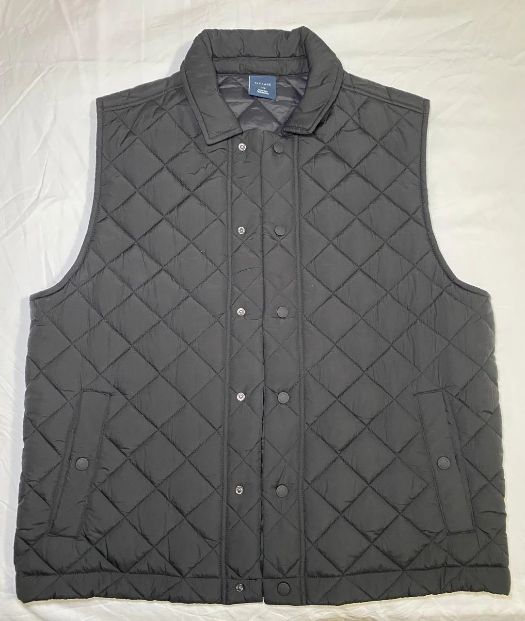 This is a black quilted vest from KIT + ACE. It features snap button closures and two side pockets. The vest is made of a smooth material and is perfect for layering.