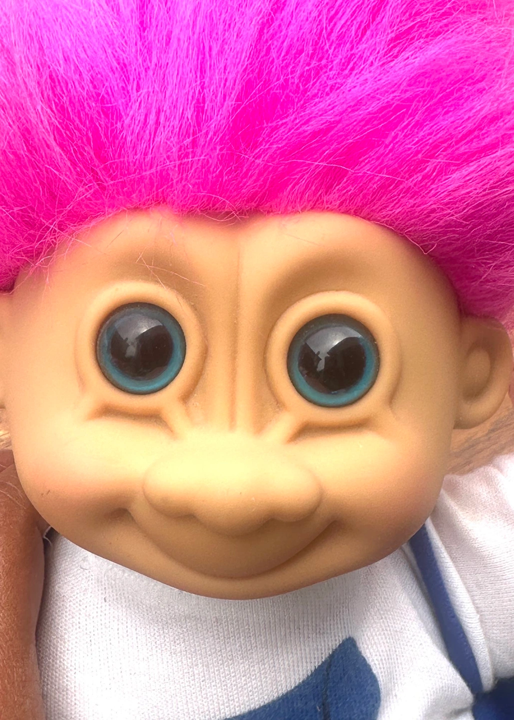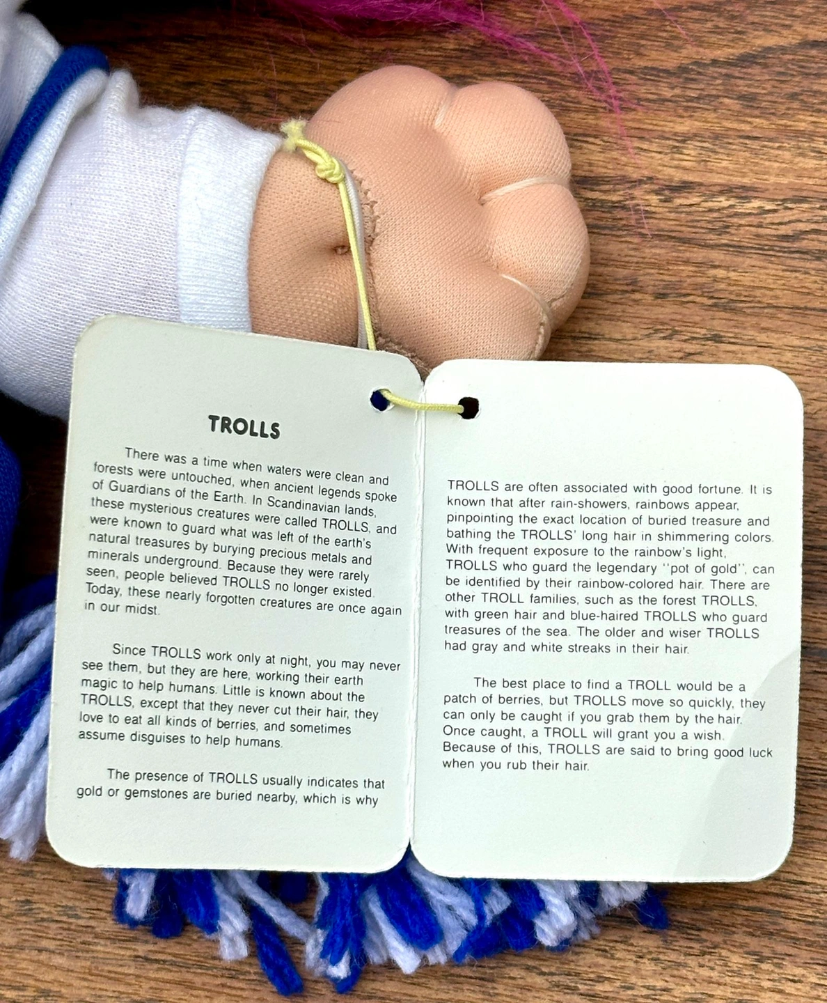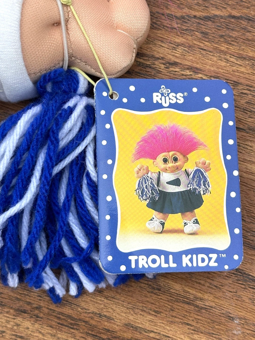 Vintage-New blue-eyed, pink-haired troll doll in a blue & white cheerleading outfit. Comes with pom-poms on both arms. Still has the original tag, indicating it's a collectible Russ Berrie product. This item has been stored away for many years. Cash only. Buyer must pick up from the Morton Grove Area.