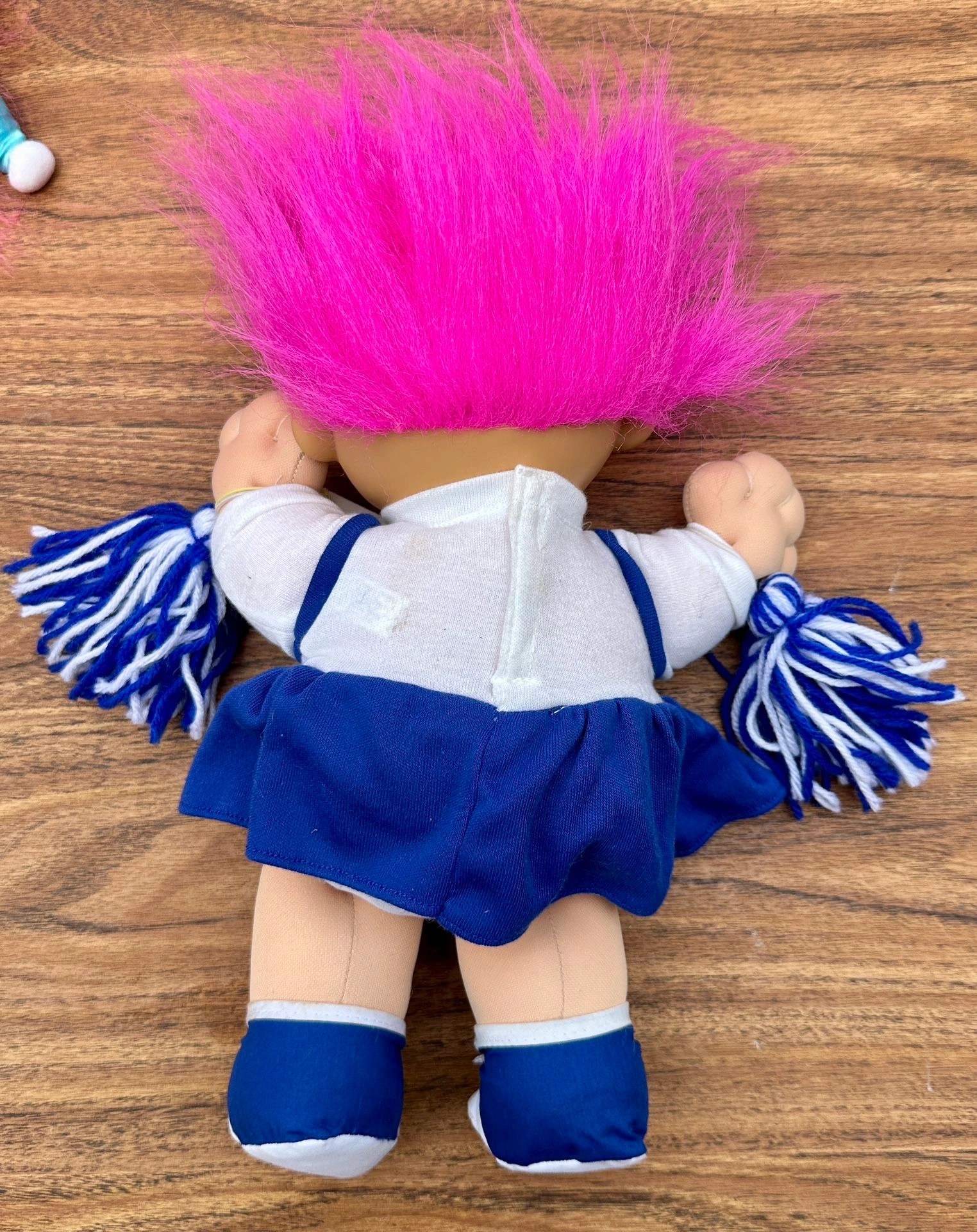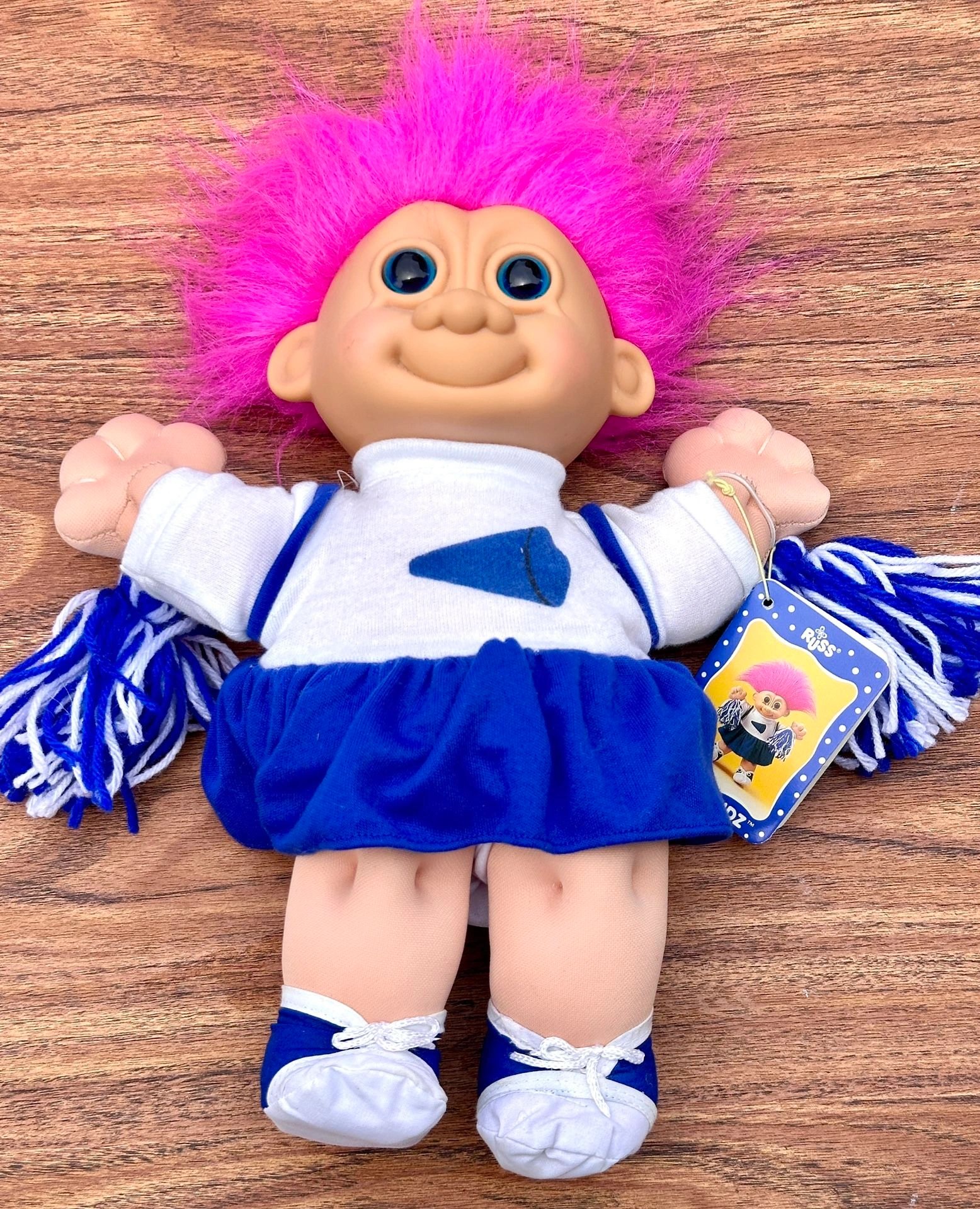 Vintage-New blue-eyed, pink-haired troll doll in a blue & white cheerleading outfit. Comes with pom-poms on both arms. Still has the original tag, indicating it's a collectible Russ Berrie product. This item has been stored away for many years. Cash only. Buyer must pick up from the Morton Grove Area.
