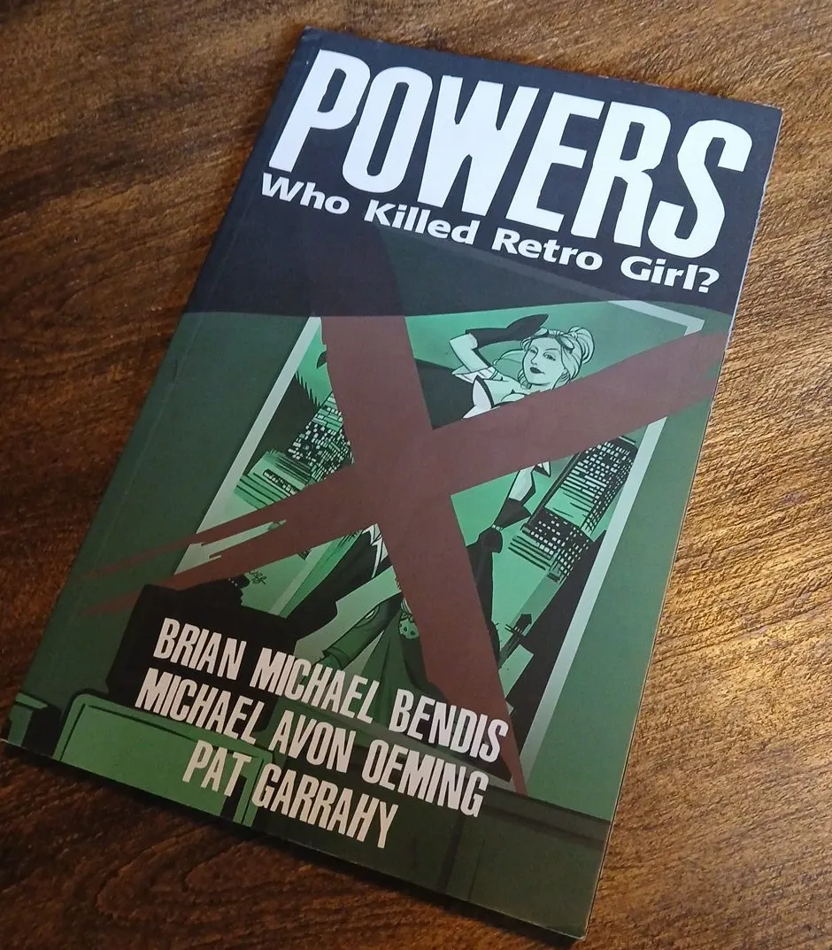 Powers: Who Killed Retro Girl? graphic novel. Written by Brian Michael Bendis and Michael Avon Oeming. Art by Pat Garrahy. A compelling mystery for comic fans.