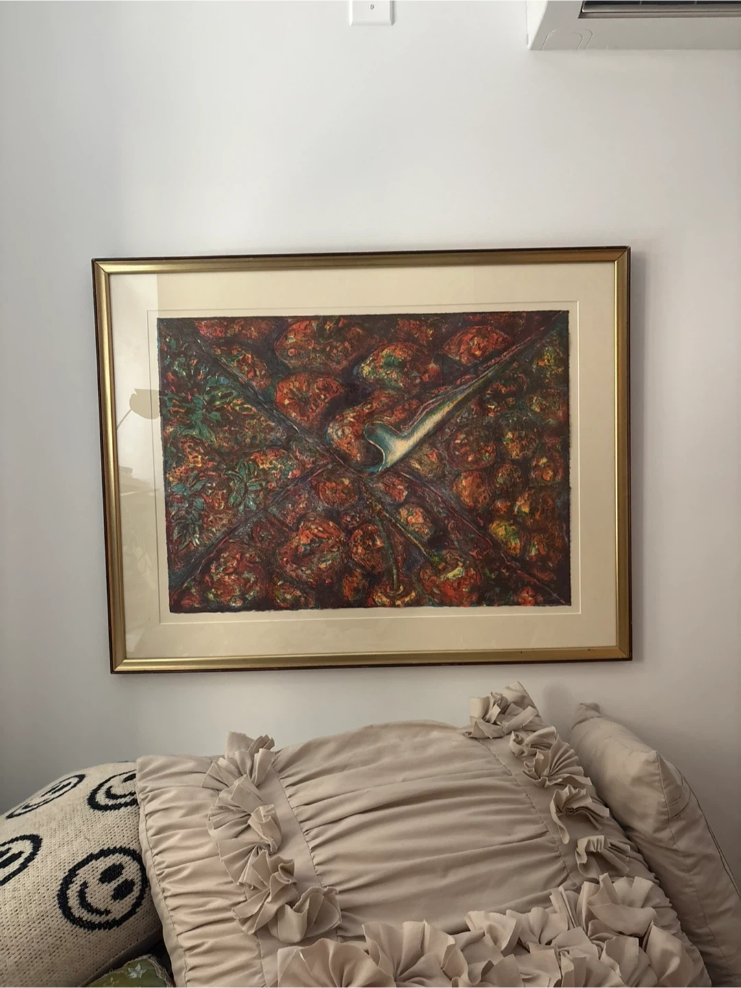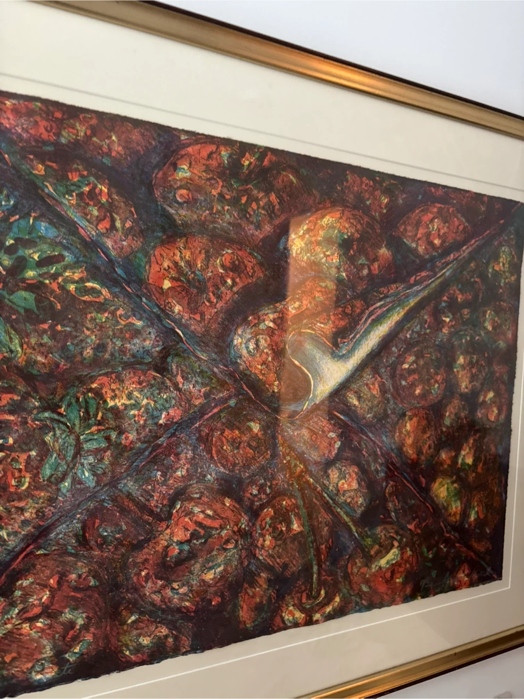This is a framed art print with an abstract design. It features a colorful, textured pattern with deep reds, oranges, and blues. The artwork is housed in a simple gold-tone frame. It's ready to hang and would add a unique touch to any room!