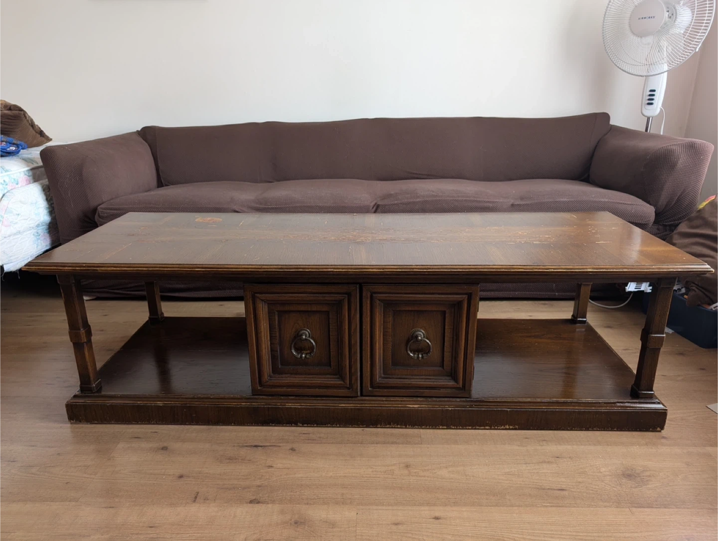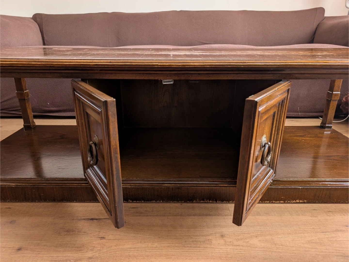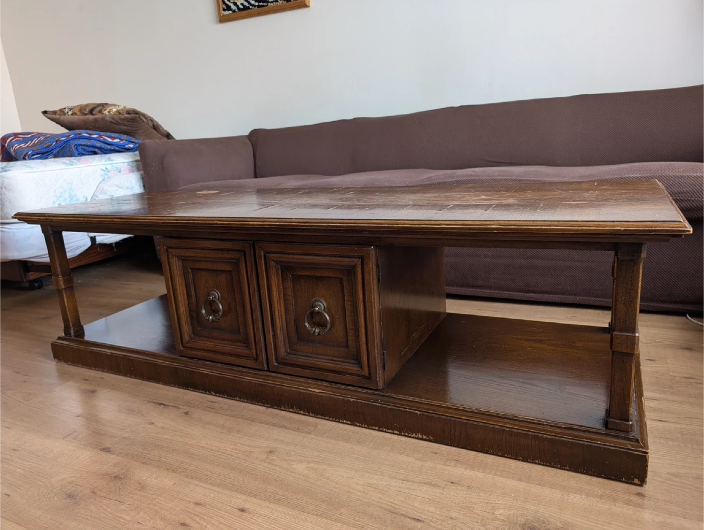 This solid wood coffee table from the 70s features decorative pulls and a lower shelf for storage. It's a sturdy piece with a classic design.