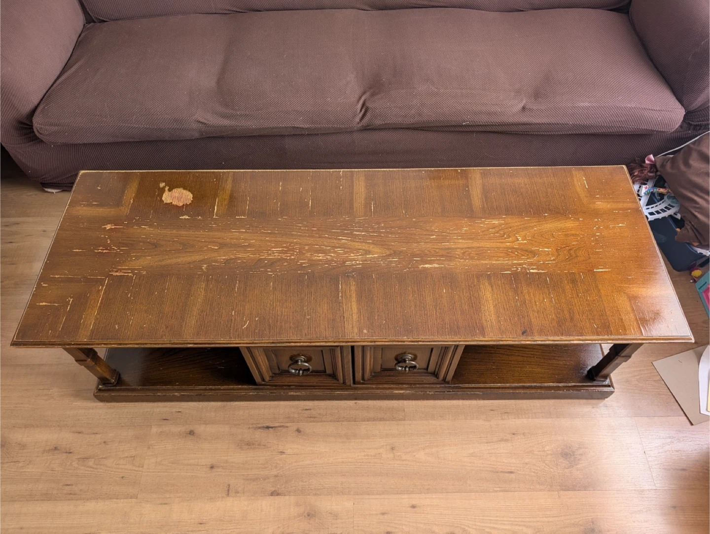 This solid wood coffee table from the 70s features decorative pulls and a lower shelf for storage. It's a sturdy piece with a classic design.