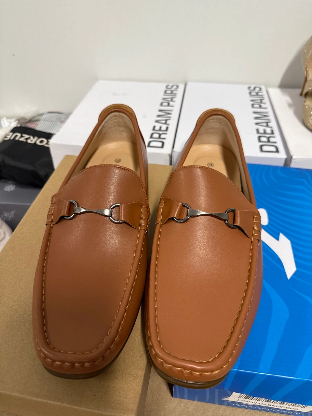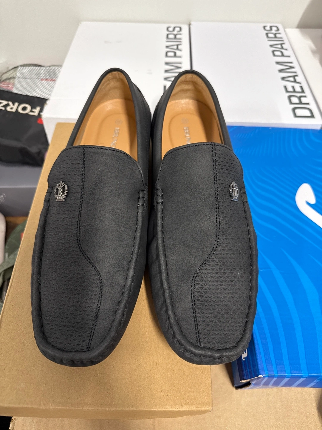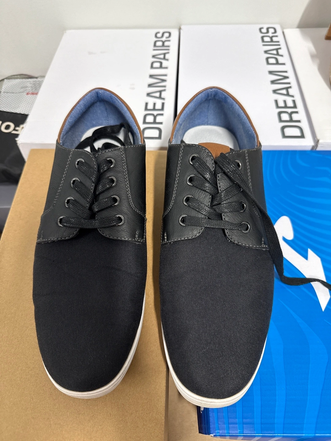 Four pairs of men's shoes. Brown loafers, black canvas lace-ups, black leather lace-ups, and black leather loafers. Various styles, great for work or casual wear. Text me for more details and sizes