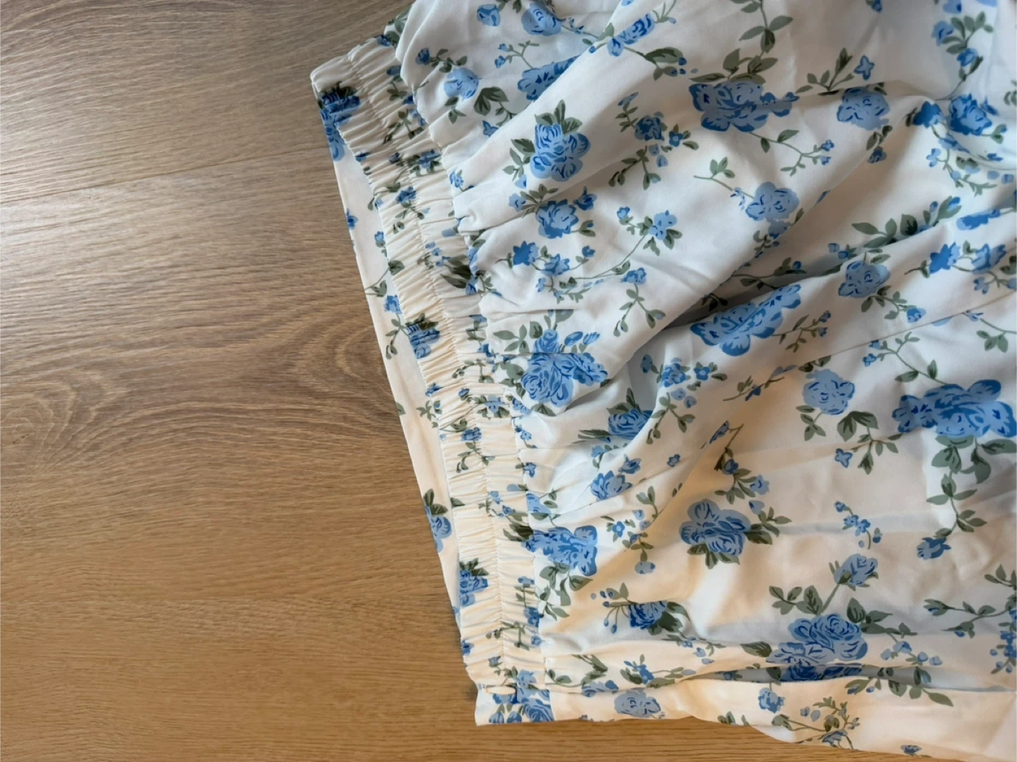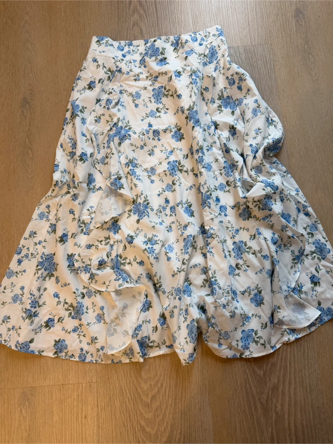 Selling a lovely skirt with a blue and white floral print! It's in great condition and would be a wonderful addition to your wardrobe. The skirt features an elastic waistband for a comfortable fit. Perfect for a casual day out or dressing up for a special occasion