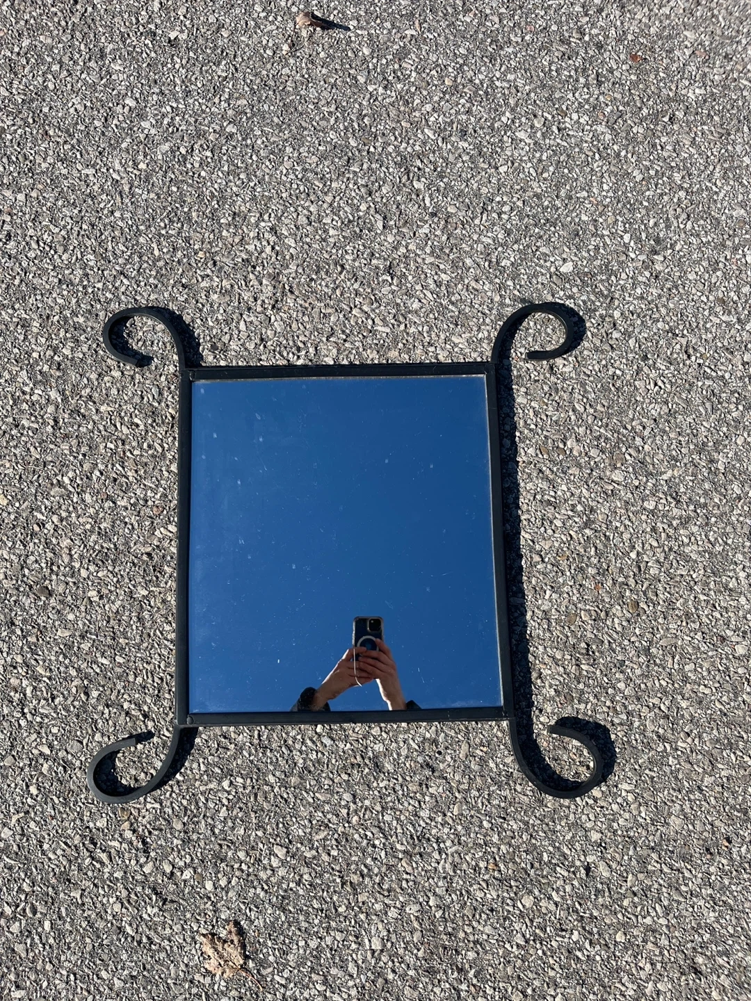 Selling a cute black metal framed mirror! It has a square mirror with decorative metal legs. It's in good condition and would look great in any room