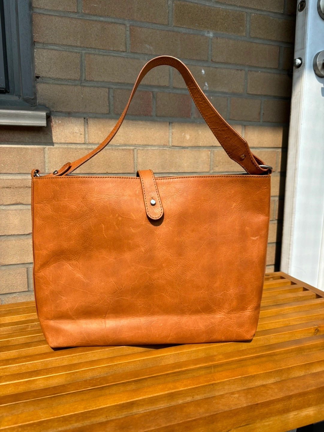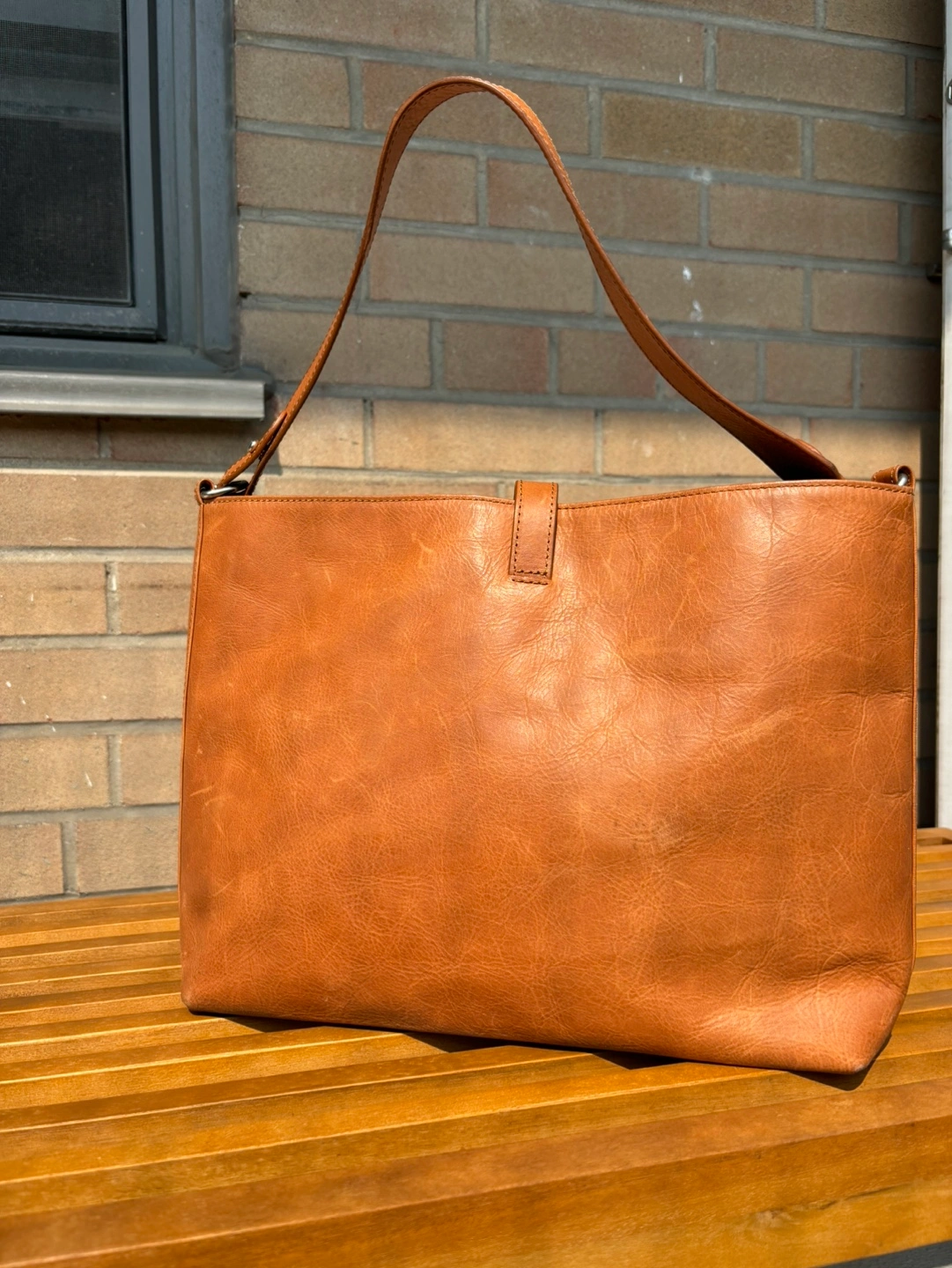 Large brown leather tote bag. Single top handle and shoulder strap. Interior pockets. Lined. Plus Free Like New Ladies Romika Sandals Size 38 (UK 5)