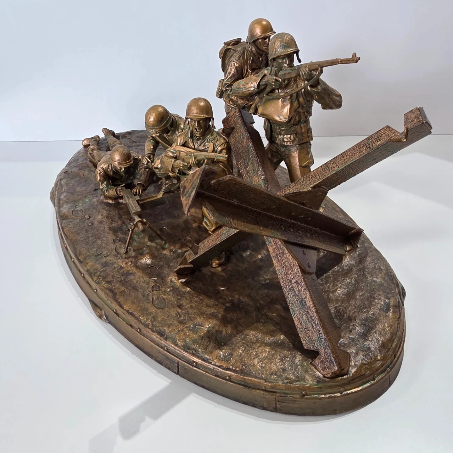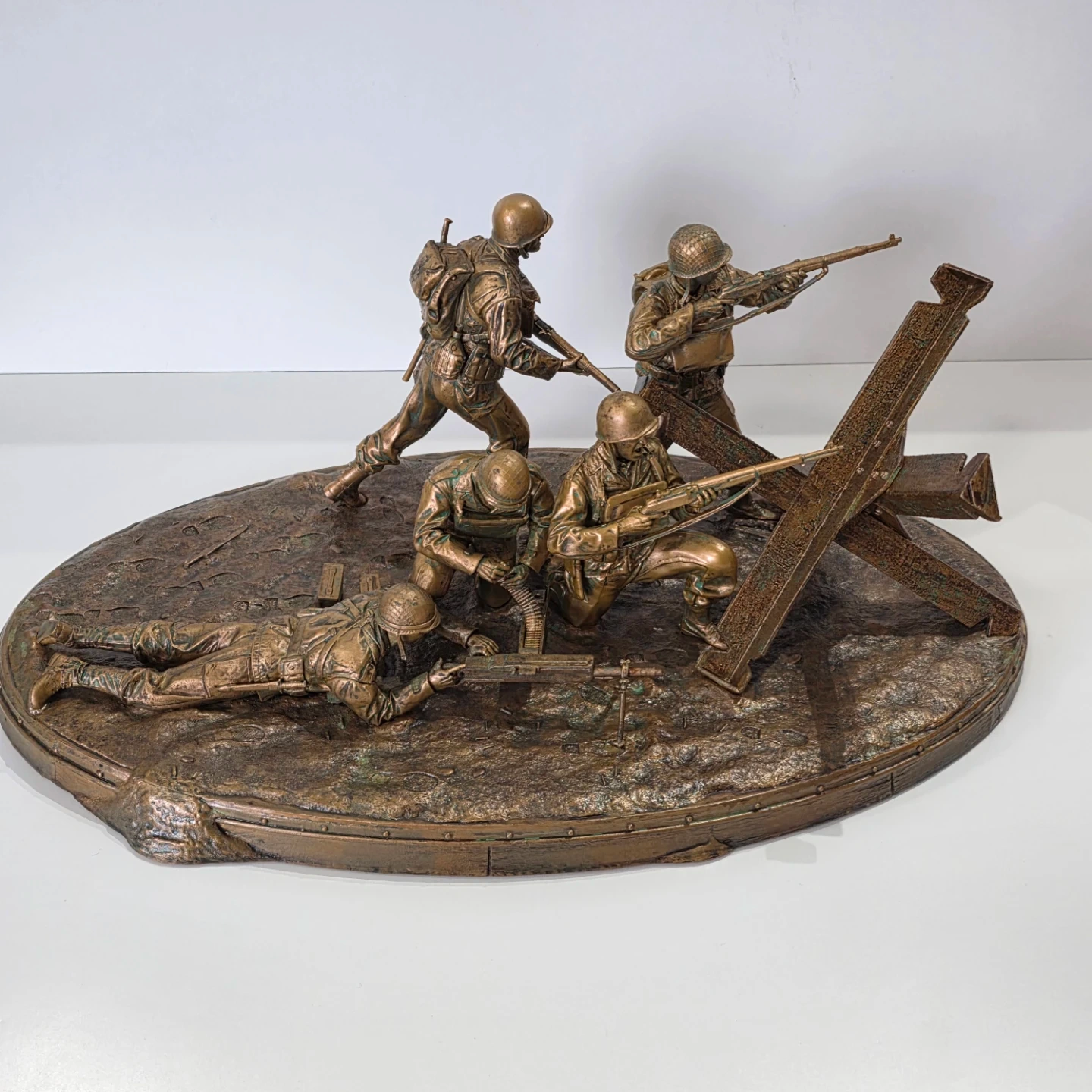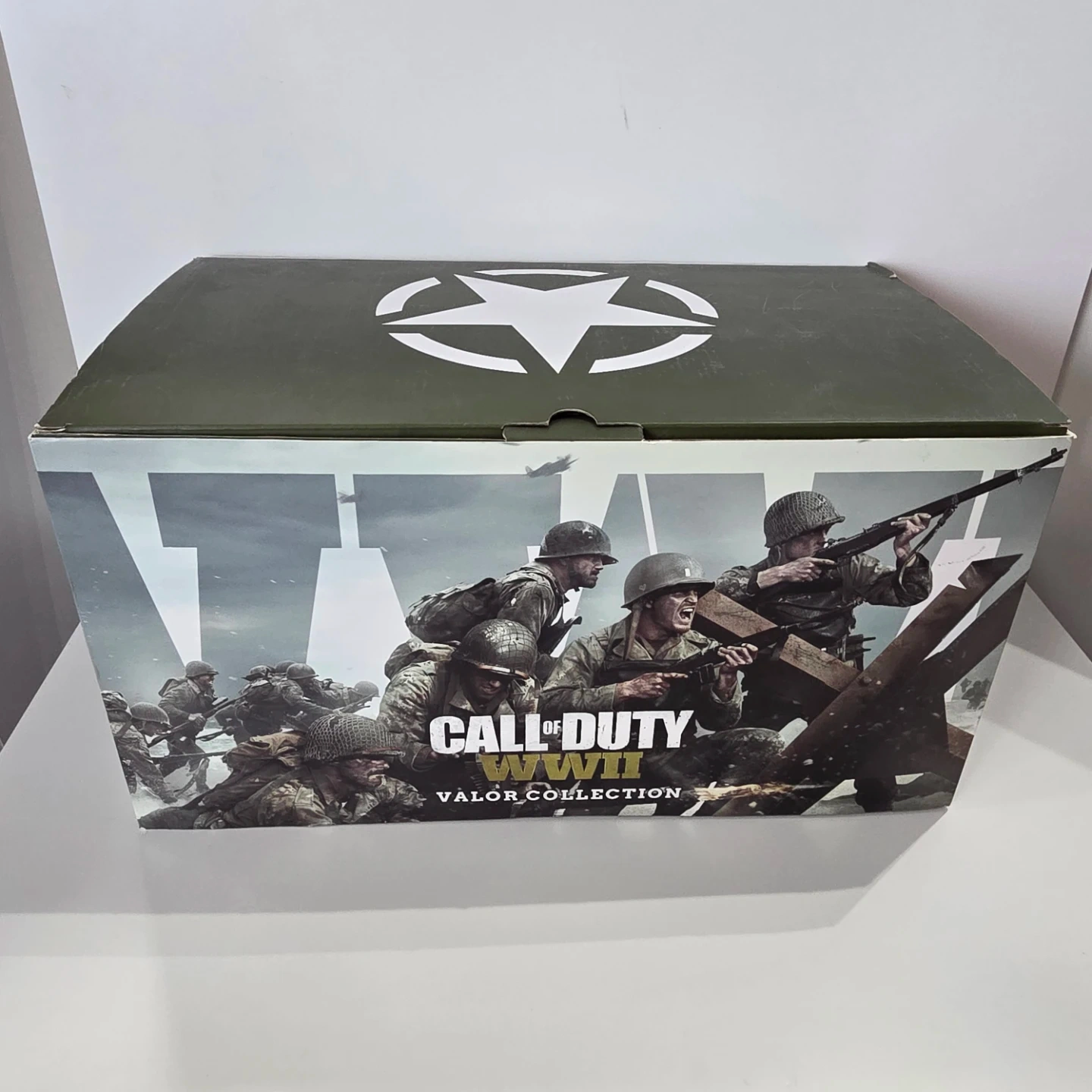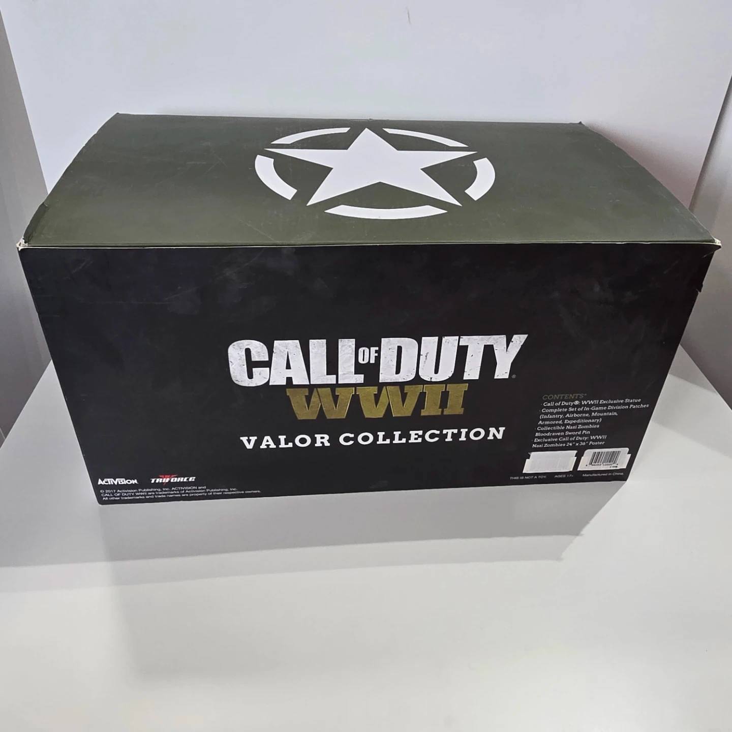 This is the Call of Duty WWII Valor Collection statue. It features a detailed bronze-finish sculpture of soldiers in combat. The collection also includes a 'Fearless' poster and other memorabilia.