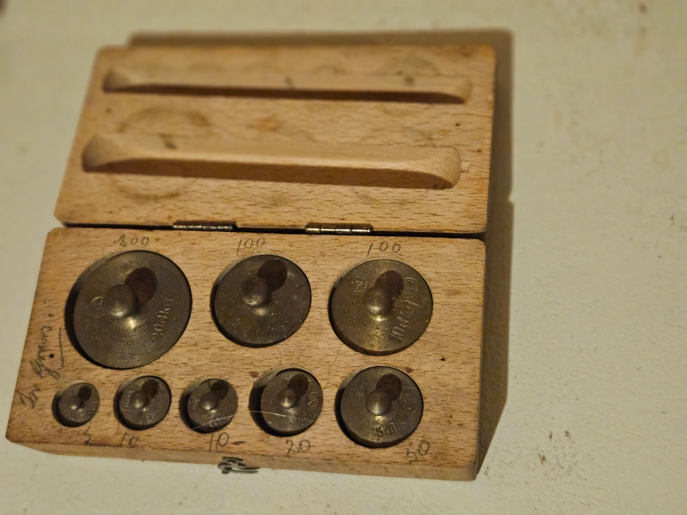 Set of vintage brass weights, various sizes. Housed in a wooden carrying case. Shows signs of age and wear. Ideal for collectors or historical reenactment.