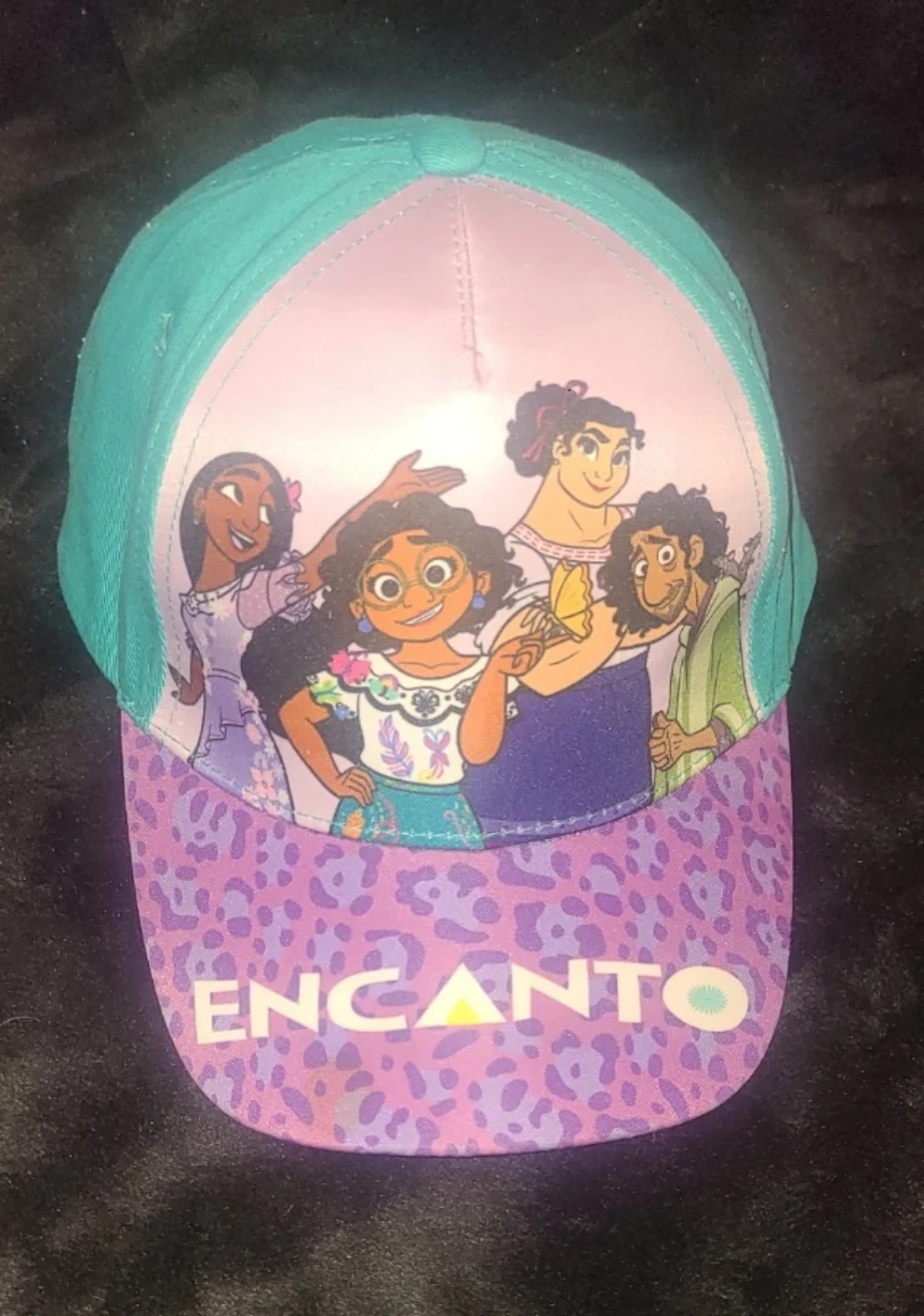 This is a Disney Encanto baseball cap featuring characters from the movie. It has a turquoise brim and back with a purple leopard print pattern on the front of the brim and a light purple crown. Adjustable strap for a comfortable fit. Perfect for young Encanto fans!