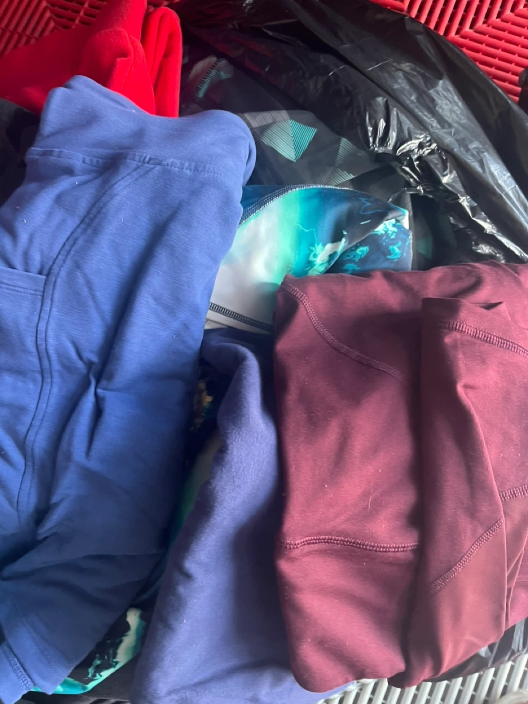 Bundle includes various leggings, sweatpants, and tops. Items are in different colours and patterns. Mostly athletic or lounge wear styles. Great for active or casual wear!