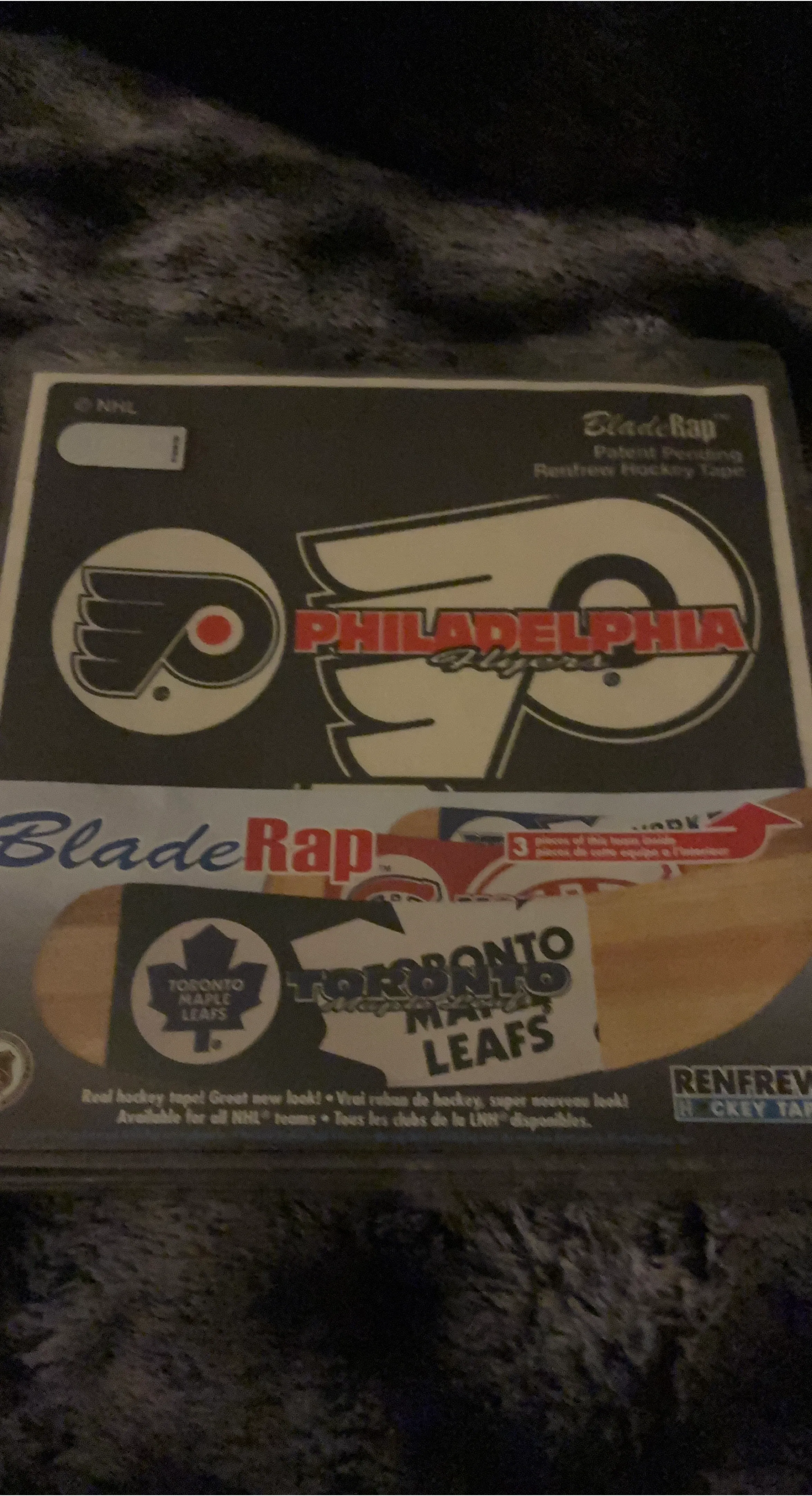 This Blade Rap hockey tape features the Philadelphia Flyers and Toronto Maple Leafs logos. It's patent pending and made by Renfrew. This tape is available for all NHL teams.