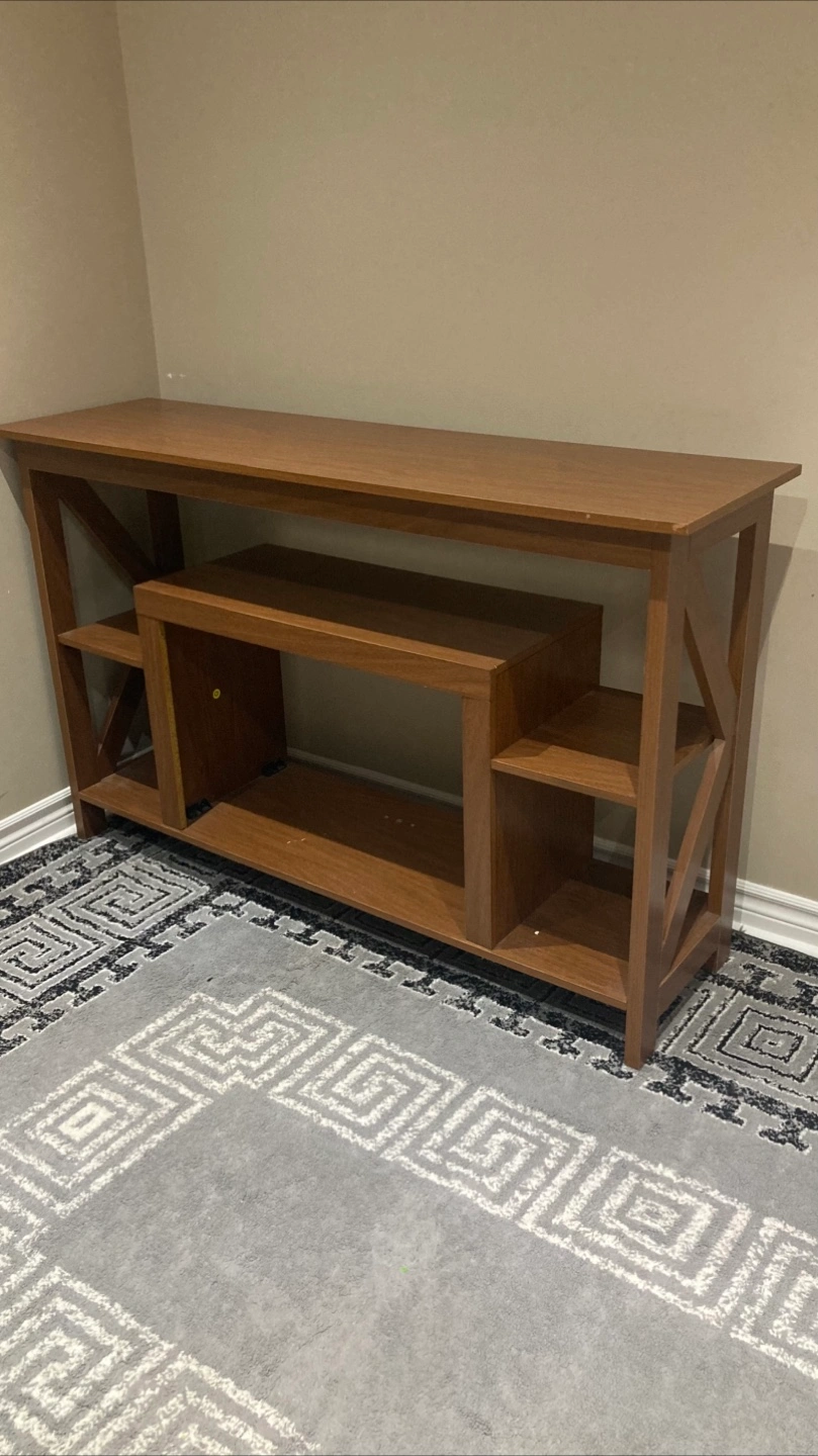 Selling a wooden console table. It's in great shape and would look great in any living room or hallway. It has a nice finish and some handy shelving for storage or display