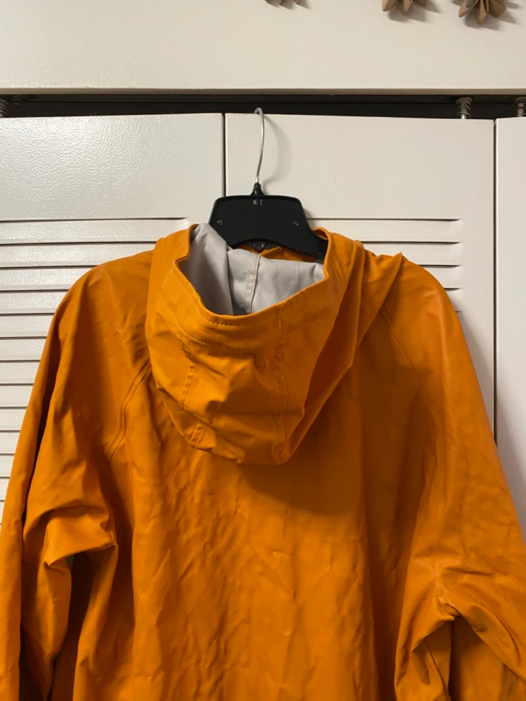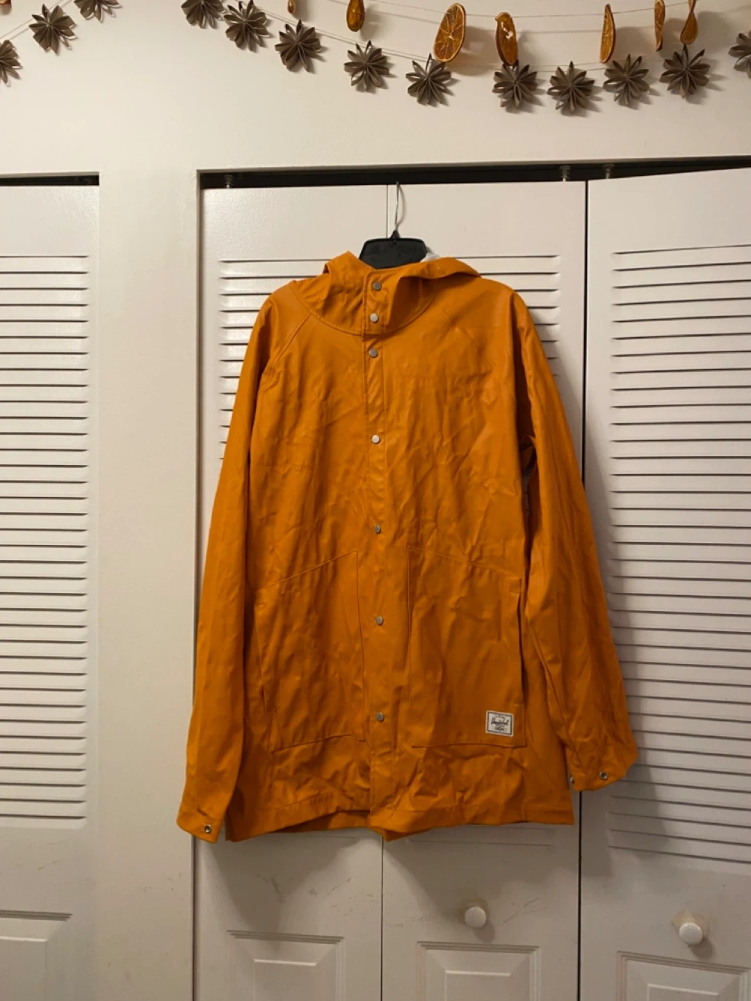 This is a Unisex Herschel Supply Co. rain jacket in a vibrant orange colour. It's a size large and features a hood and front pockets. It's made from a water-proof material. A great jacket for keeping dry on rainy days!