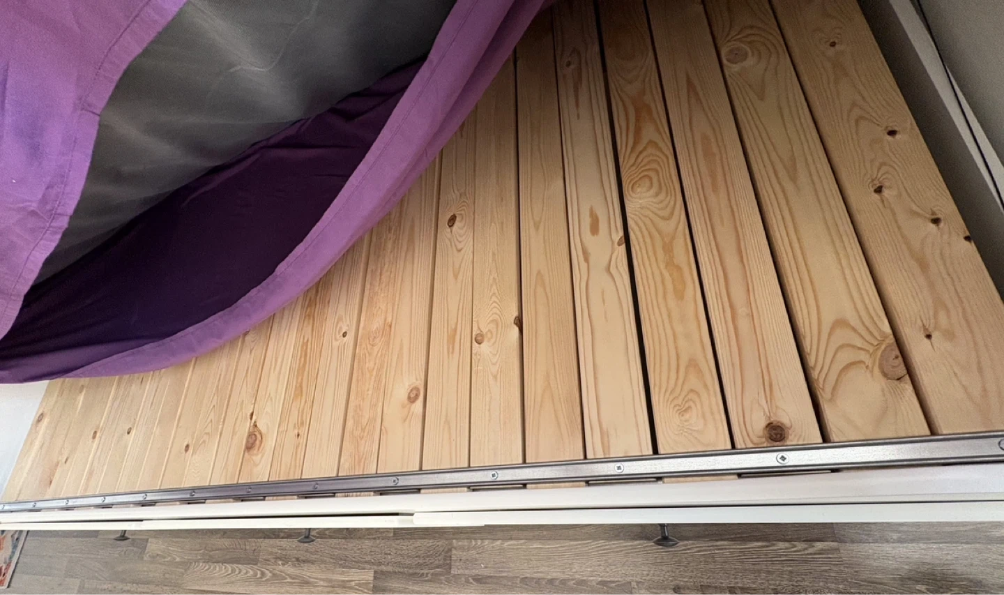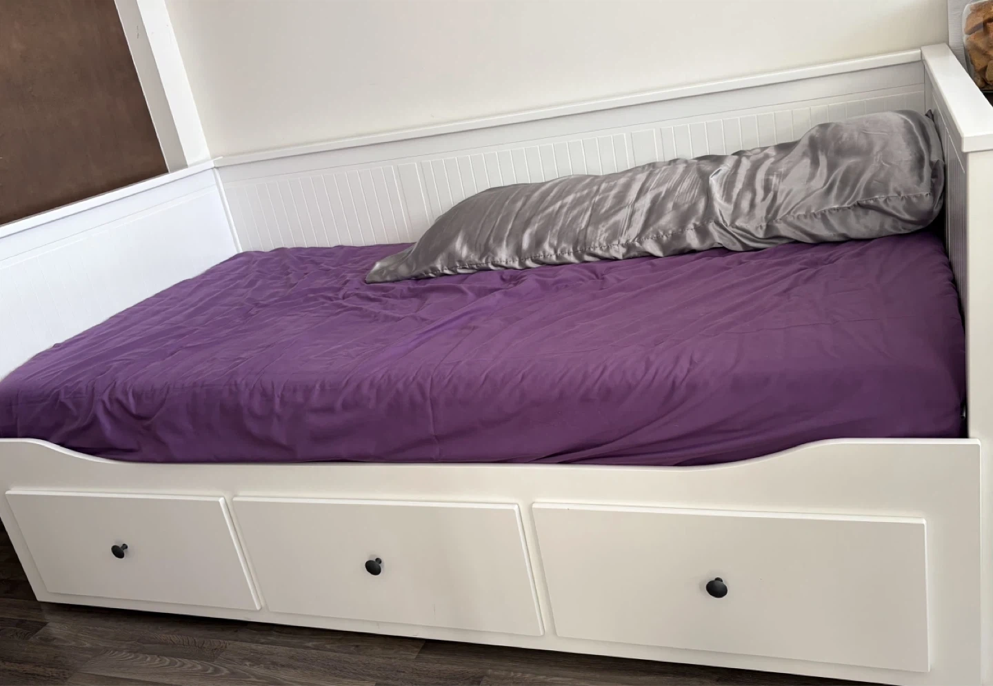 This white daybed features a slatted wood base and three built-in drawers for storage. It's a versatile piece that can function as a sofa or a bed. Perfect for smaller spaces or guest rooms!