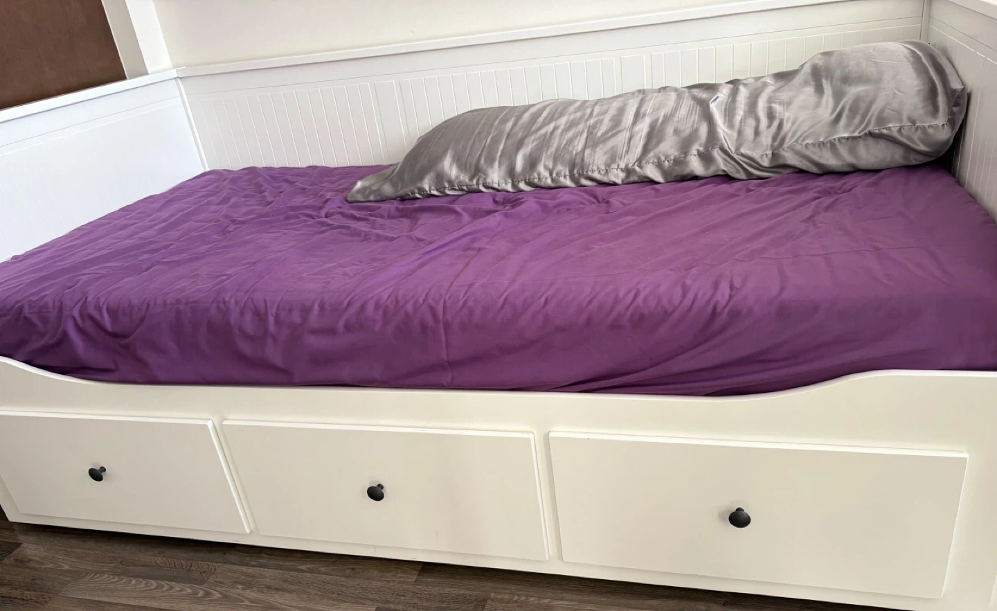 This white daybed features a slatted wood base and three built-in drawers for storage. It's a versatile piece that can function as a sofa or a bed. Perfect for smaller spaces or guest rooms!