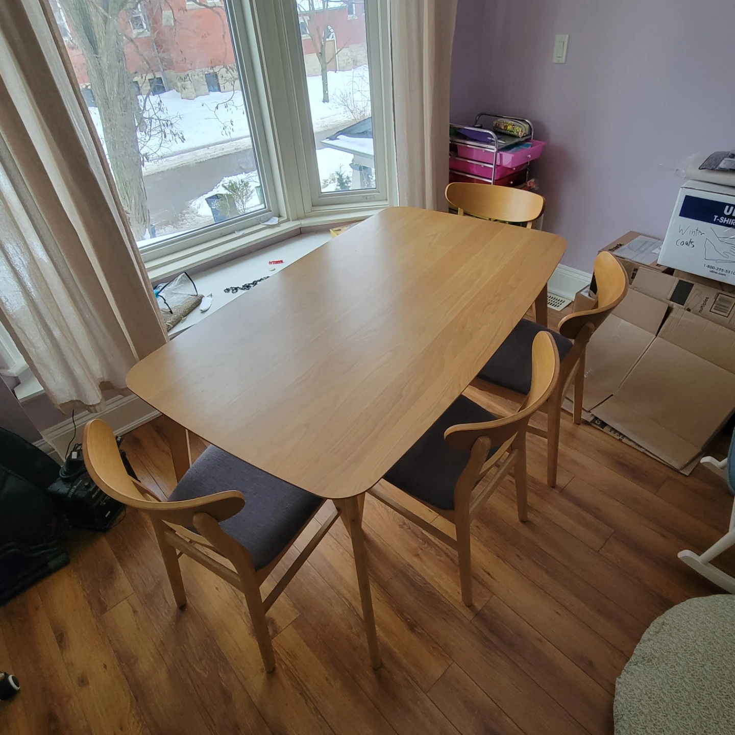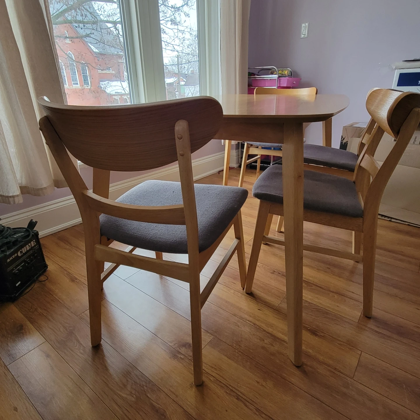 Light wood dining table + four matching chairs with grey upholstered seats. A few faint scuff marks, but nothing major. I accept e-transfer, and will leave it on the porch for pickup. Get this thing off my porch and into your home!