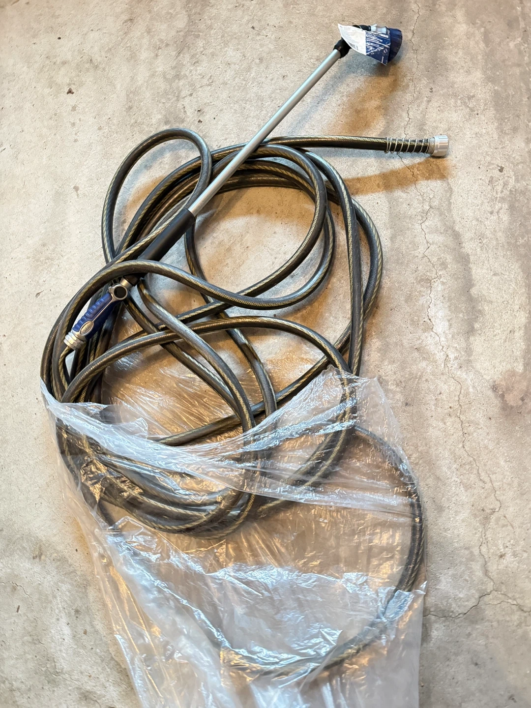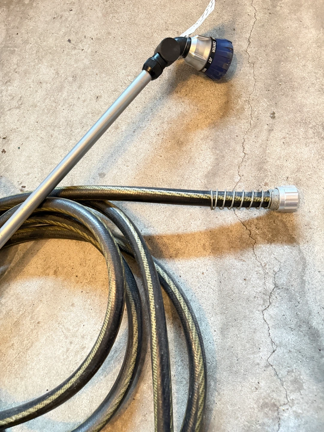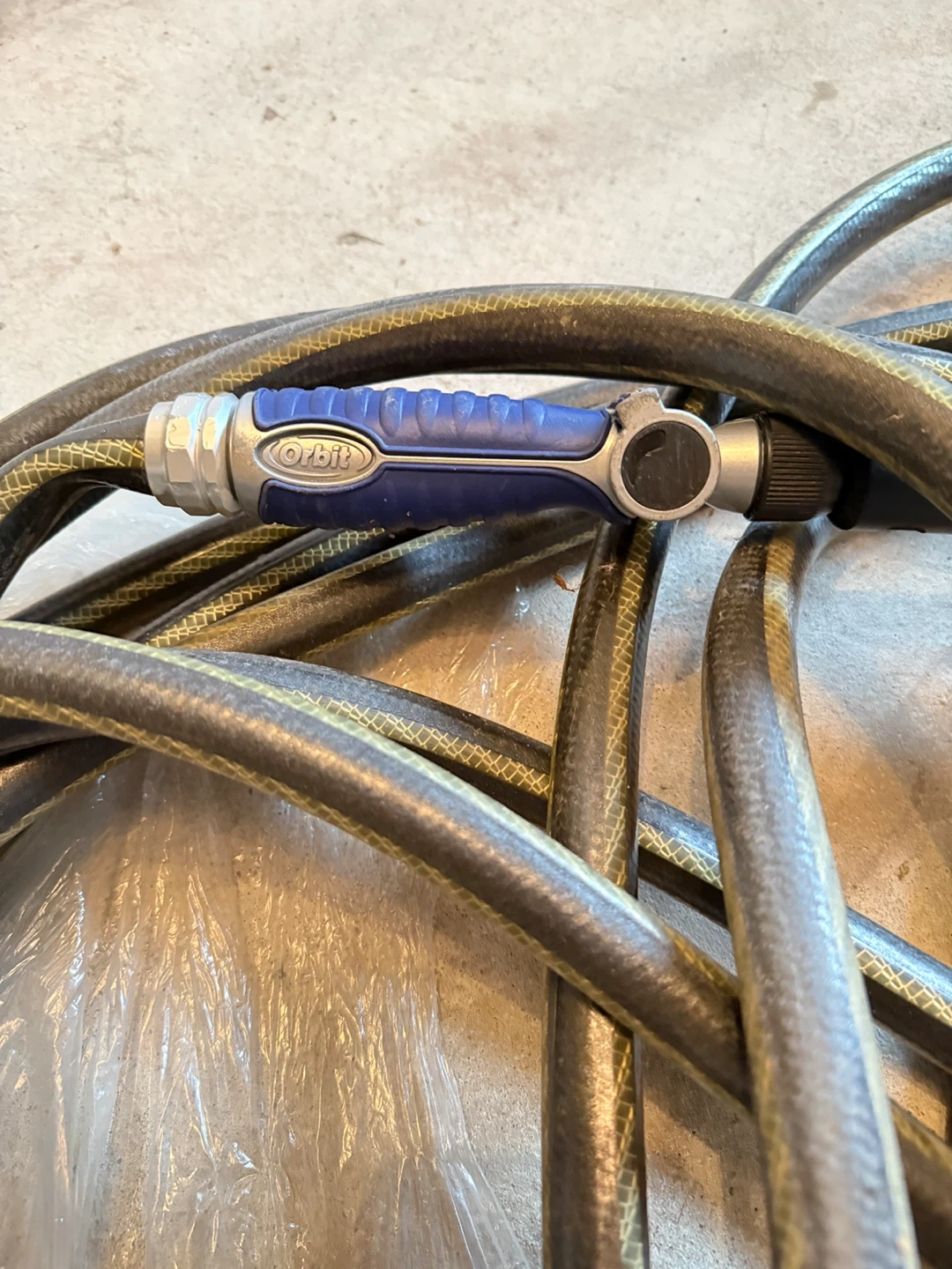 This Orbit garden hose comes with a spray nozzle. It's a sturdy hose for watering your lawn and garden. Great for keeping your plants healthy! Heavy duty