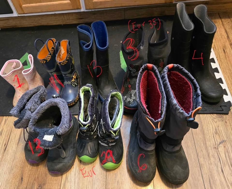 Shoes and boots that have been in storage as they no longer fit anyone. Sizes are listed with each pair. Well-known brands. Kids' shoes/boots and adult shoes/boots are $1 each pair, or bundle and make an offer. Pick up is in Sulphide (Tweed).