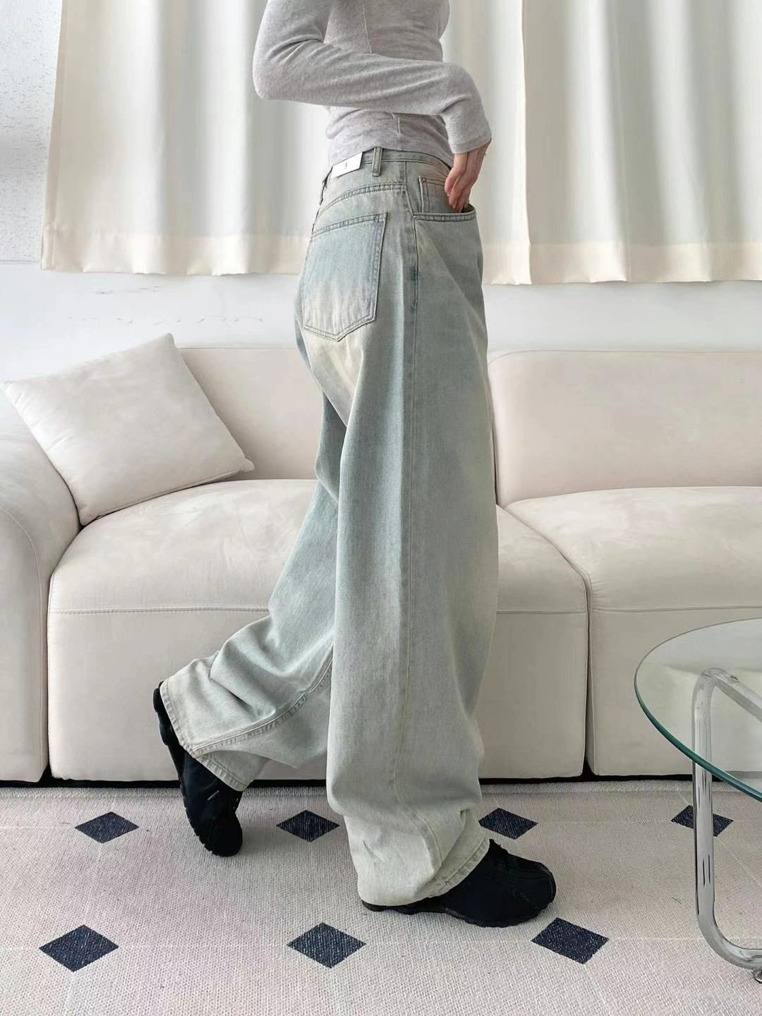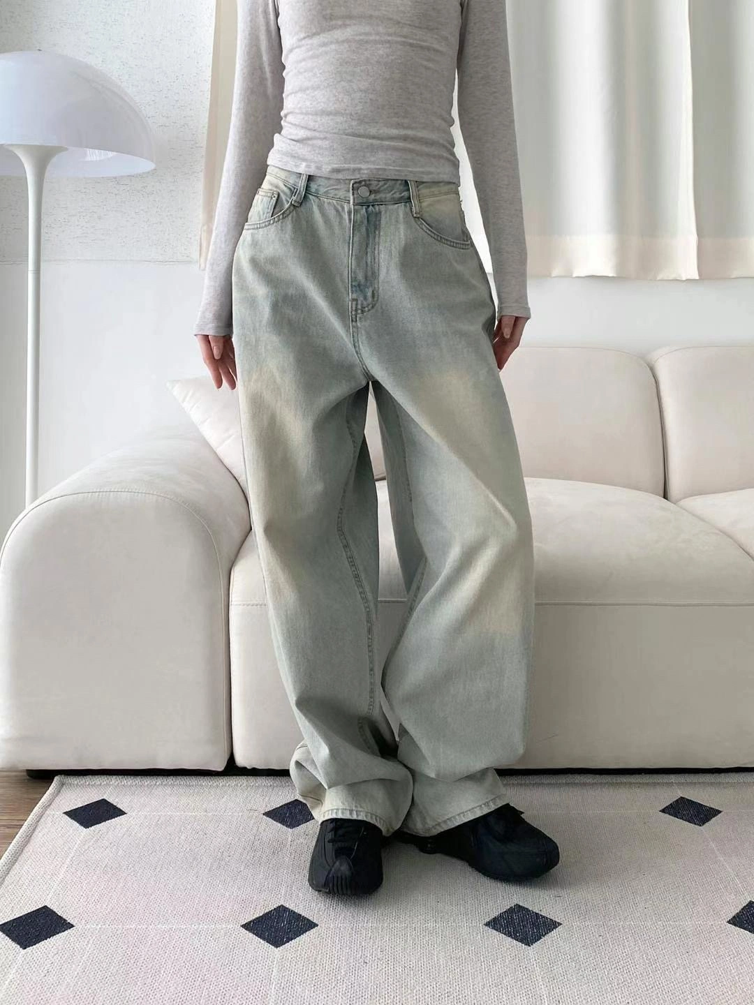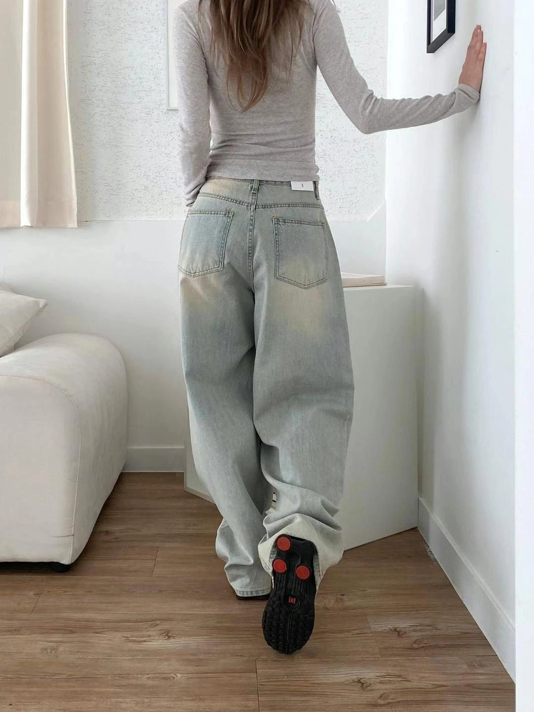 High-waisted, light wash blue denim jeans. Relaxed, wide-leg fit. Long length. Good for casual wear.
