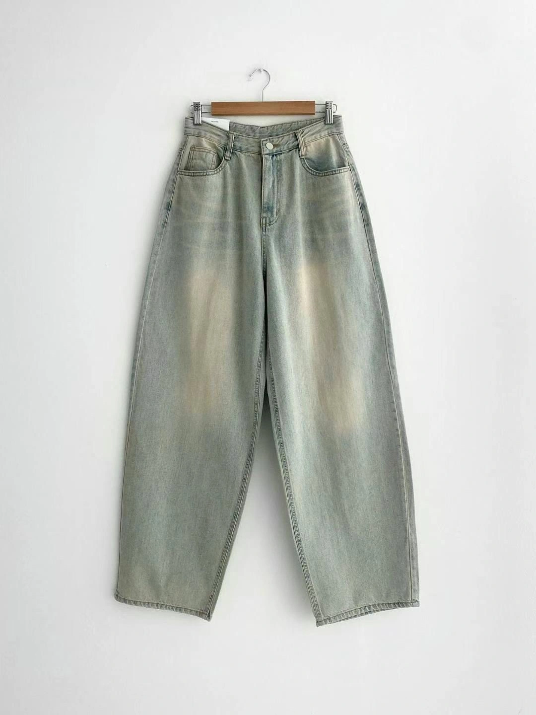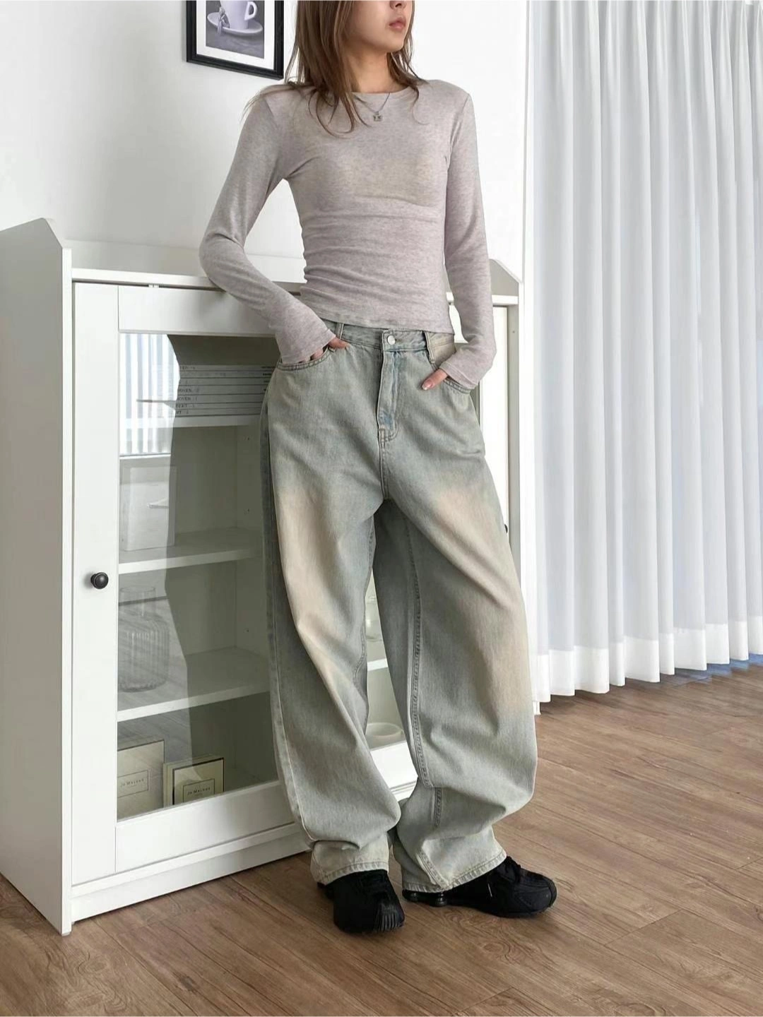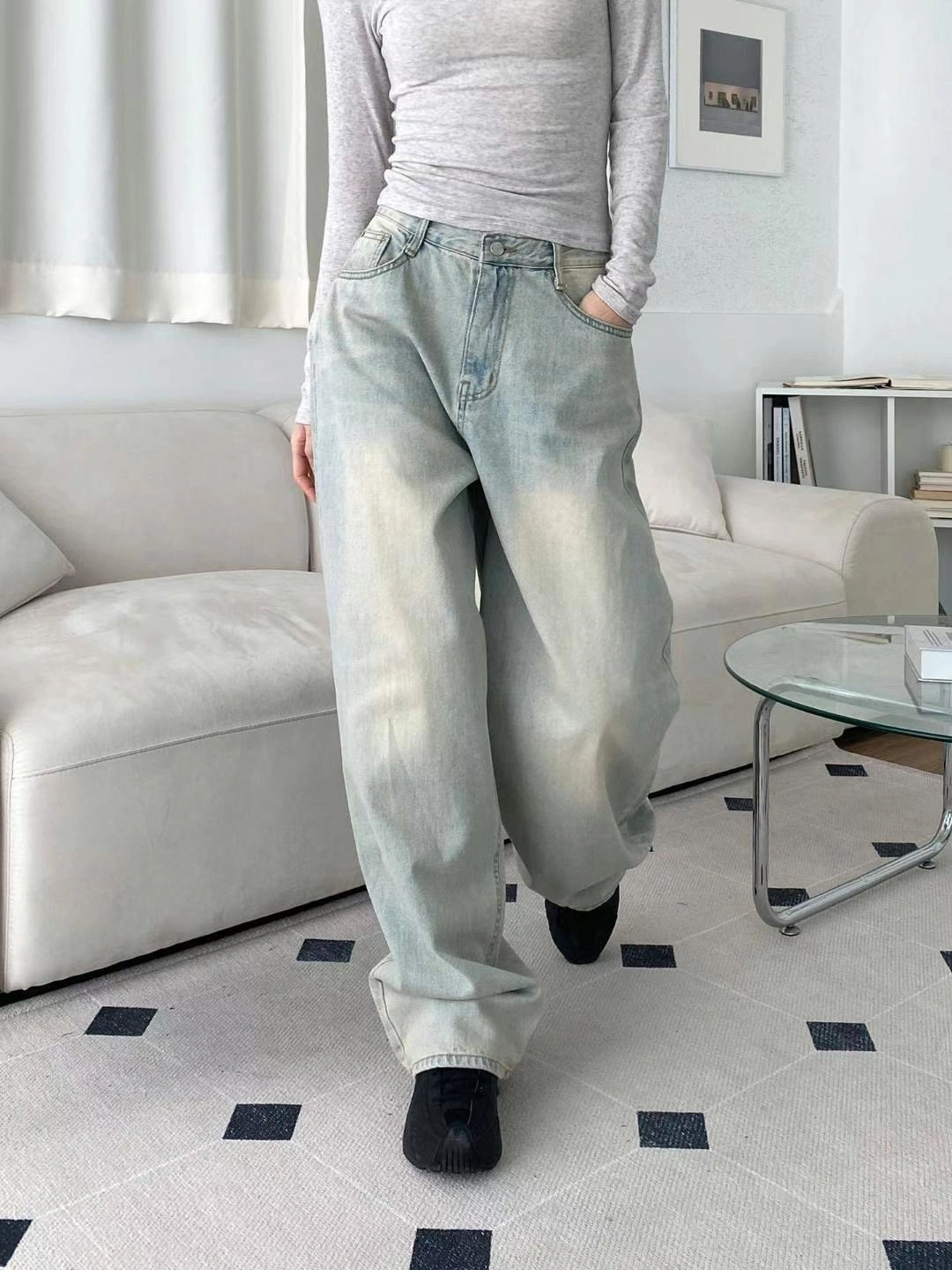 High-waisted, light wash blue denim jeans. Relaxed, wide-leg fit. Long length. Good for casual wear.