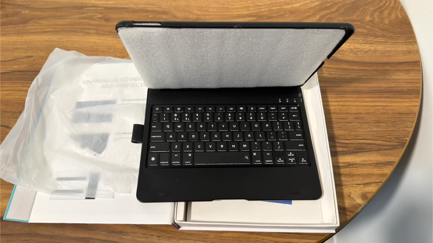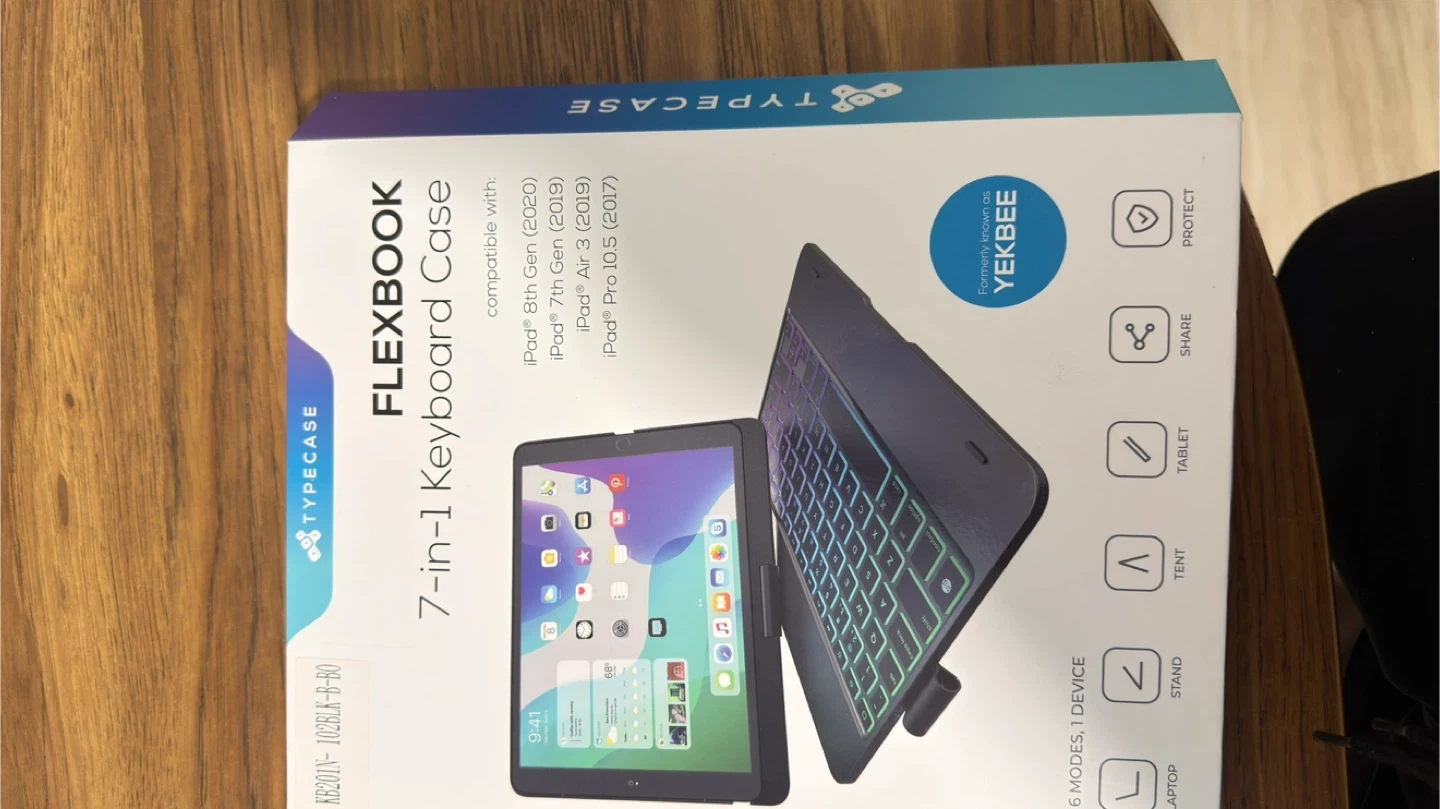 This TYPECASE FLEXBOOK 7-in-1 keyboard case offers RGB LED backlighting and is compatible with various iPad models. It's designed for iPad 8th Gen (2020), 7th Gen (2019), Air 3 (2019), and iPad Pro 10.5 (2017). The case provides full access to ports and features a sleek, protective design.