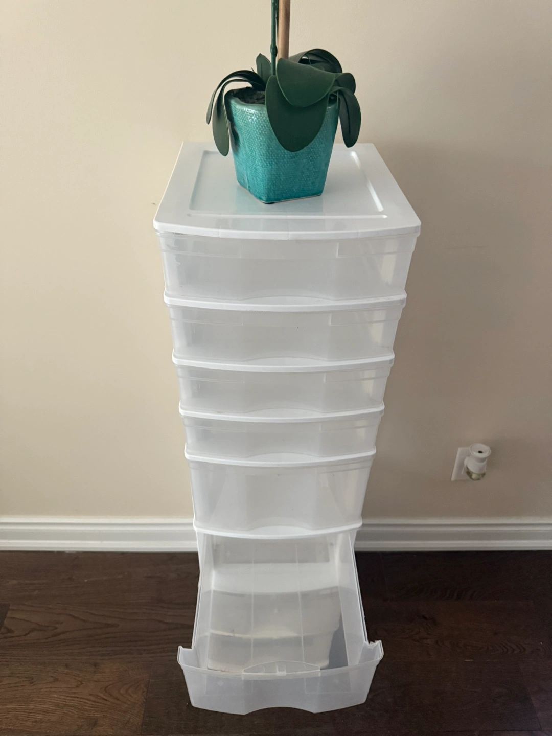 Selling a tall white plastic storage tower. It's perfect for organizing your space and keeping things tidy. It has multiple drawers, providing ample storage. Great for any room in the house!
