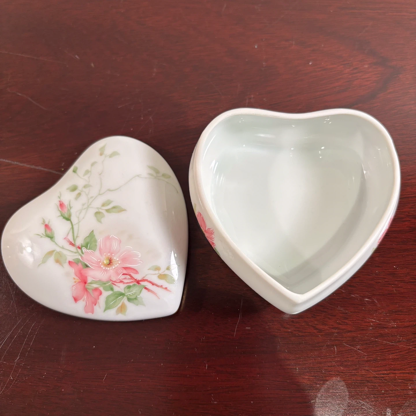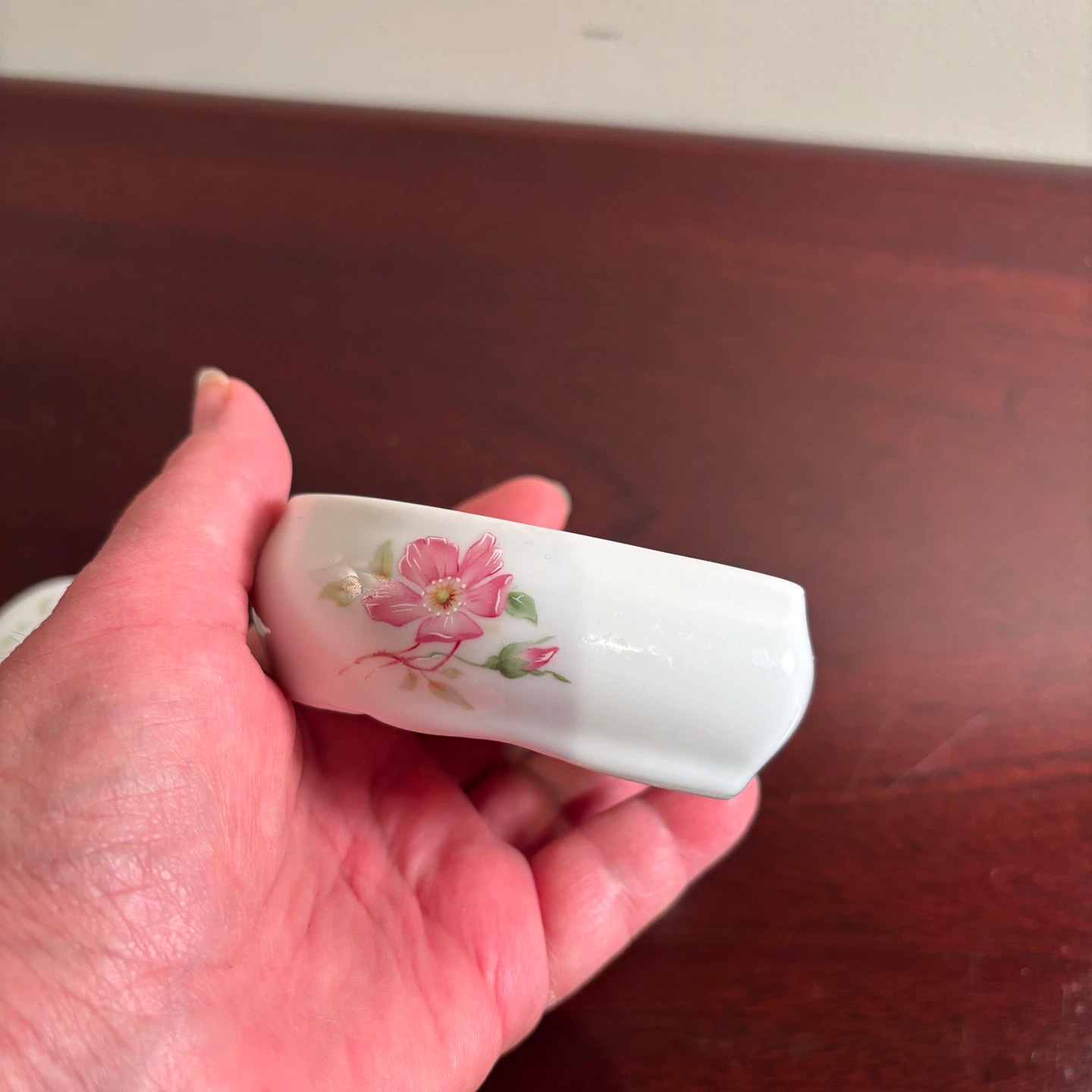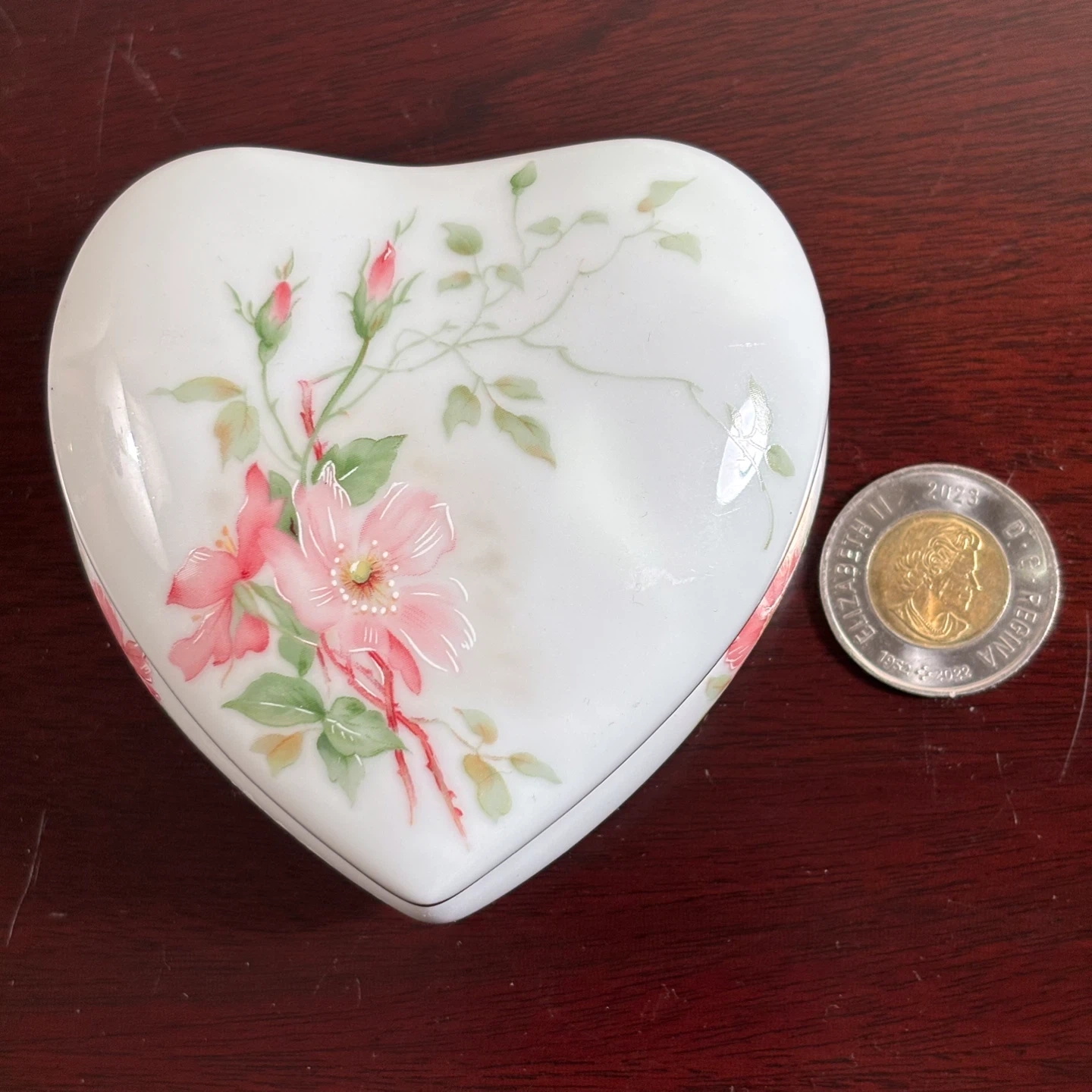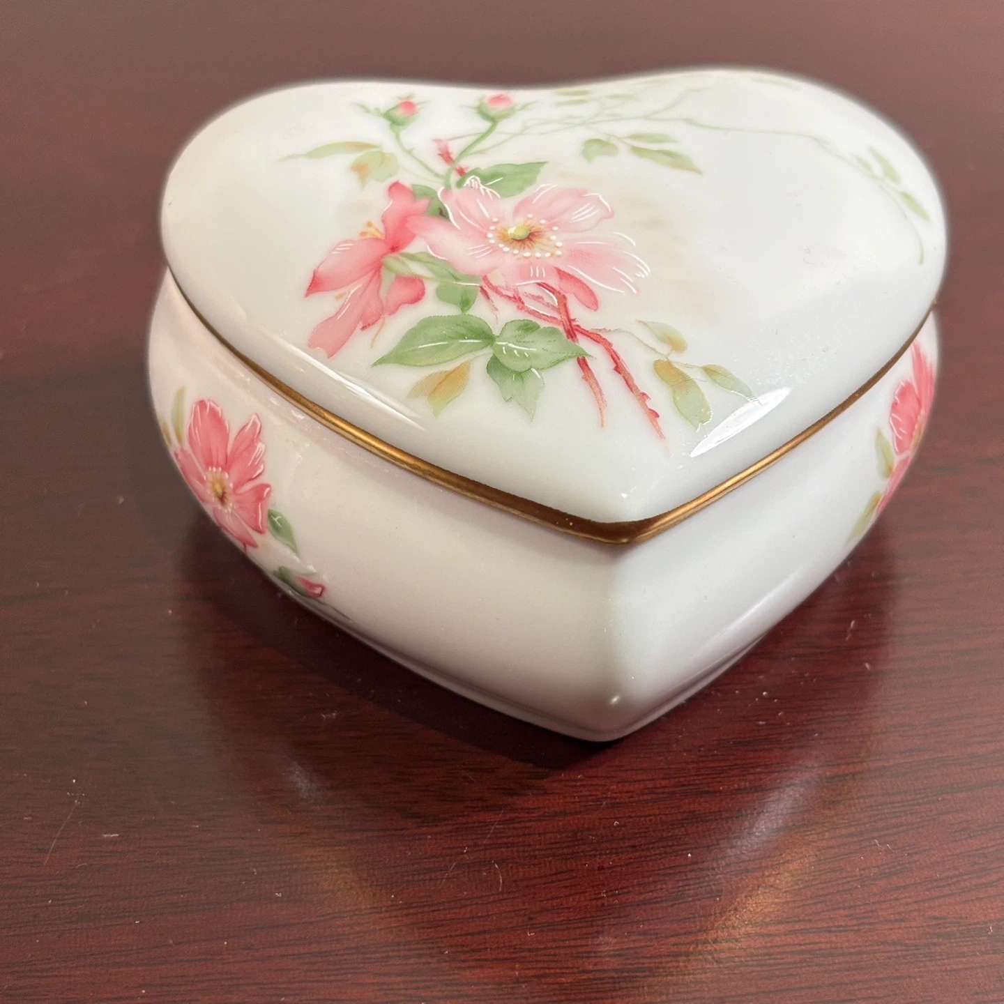 Lovely heart-shaped porcelain trinket box from LEC Limoges France for R.Lecair, featuring delicate floral hand-painting. It's perfect for storing small treasures. The gold trim adds a touch of elegance. A perfect Valentines or Mothers Day gift!