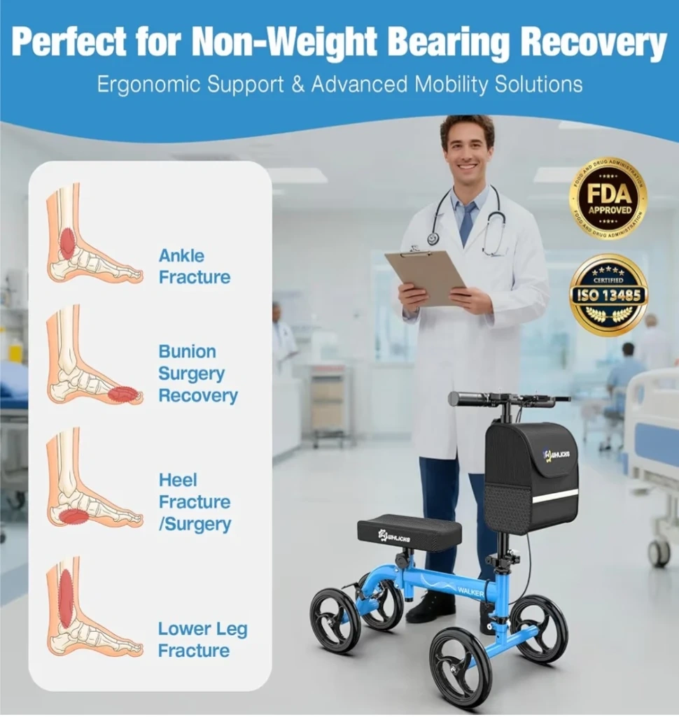 Ideal for adults recovering from foot surgery, ankle sprains, leg fractures, or below-knee amputations, WHLICKS knee scooter reduces pressure on injured areas ,enabling a smoother recovery process. Whether you’re moving around at home, at work, or outdoors, this scooter keeps you active and independent.