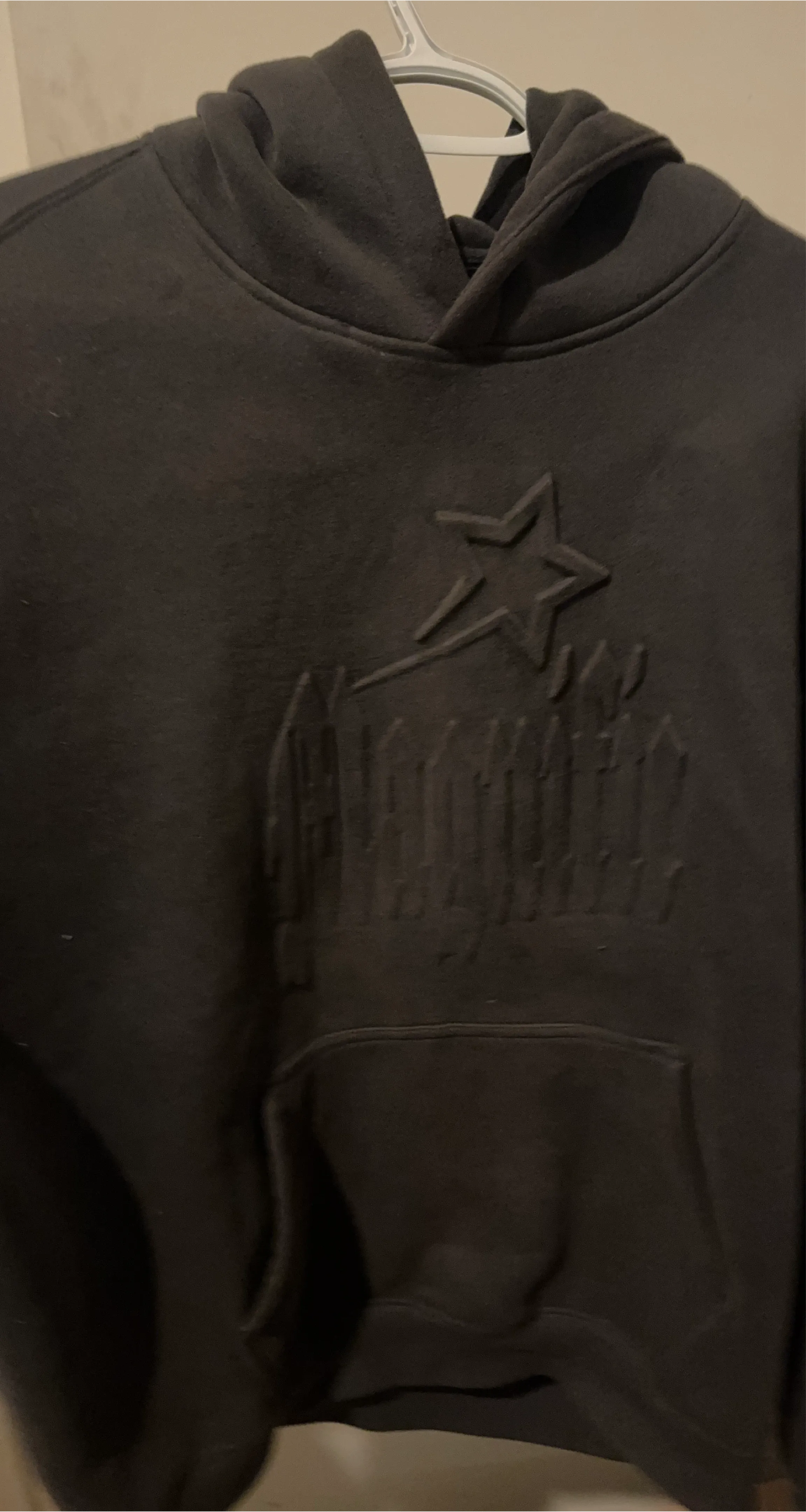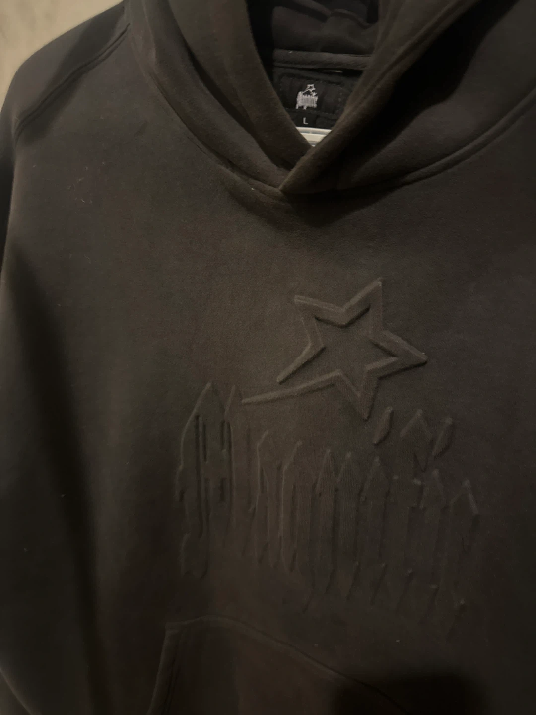This is a black hoodie featuring an embossed graphic design on the front. It's a size large and includes a front pouch pocket. The material is soft and comfortable for everyday wear.