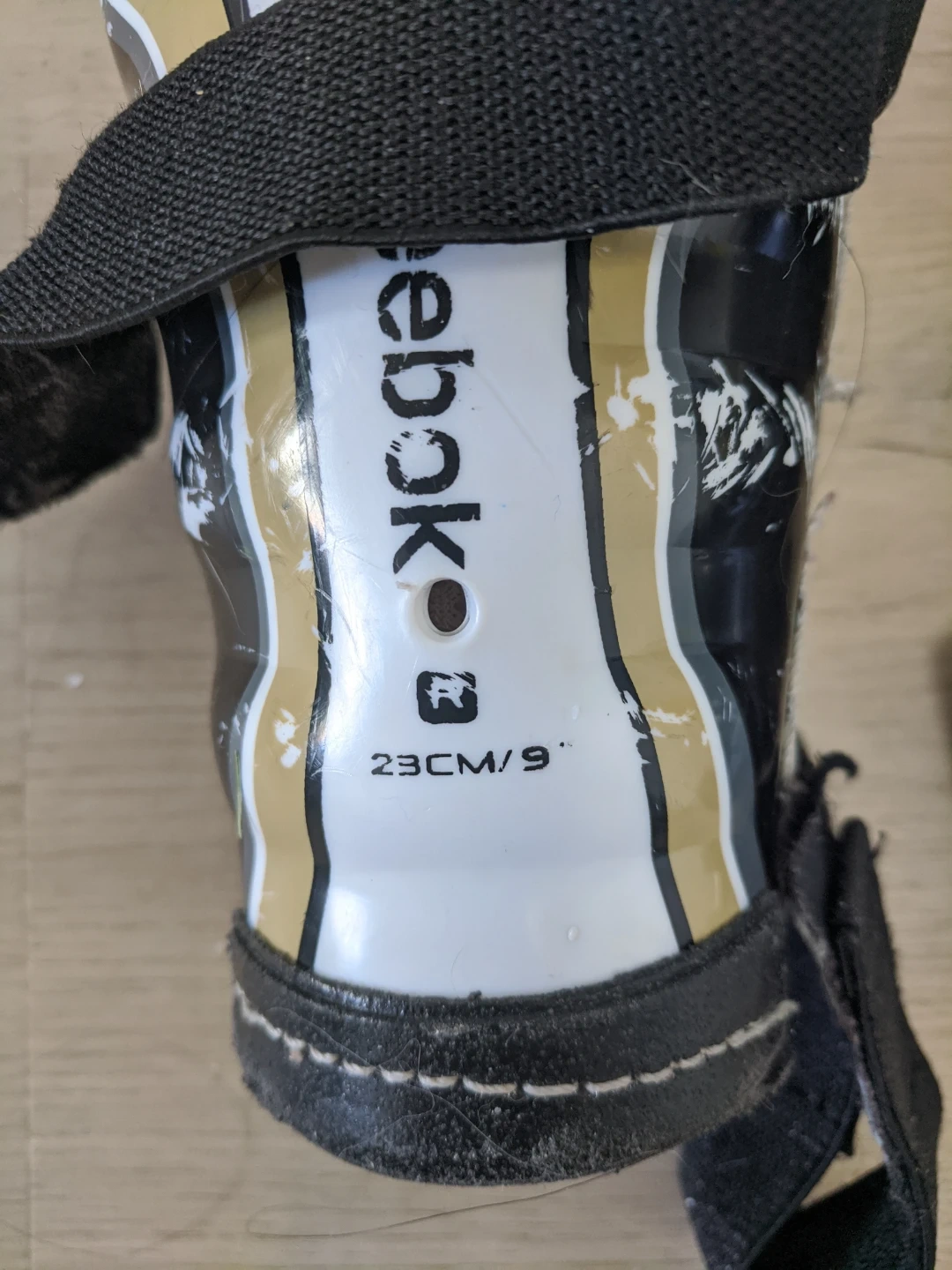 Pair of Reebok SC3 shin guards for hockey. They are white with gold and black accents. Measures 23 cm / 9".