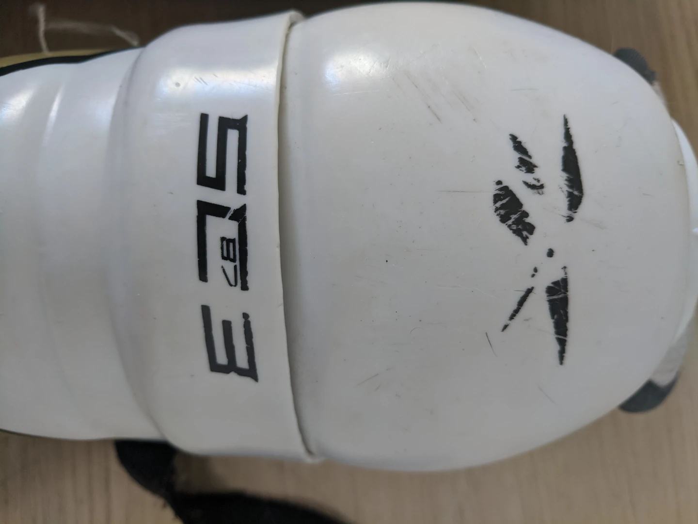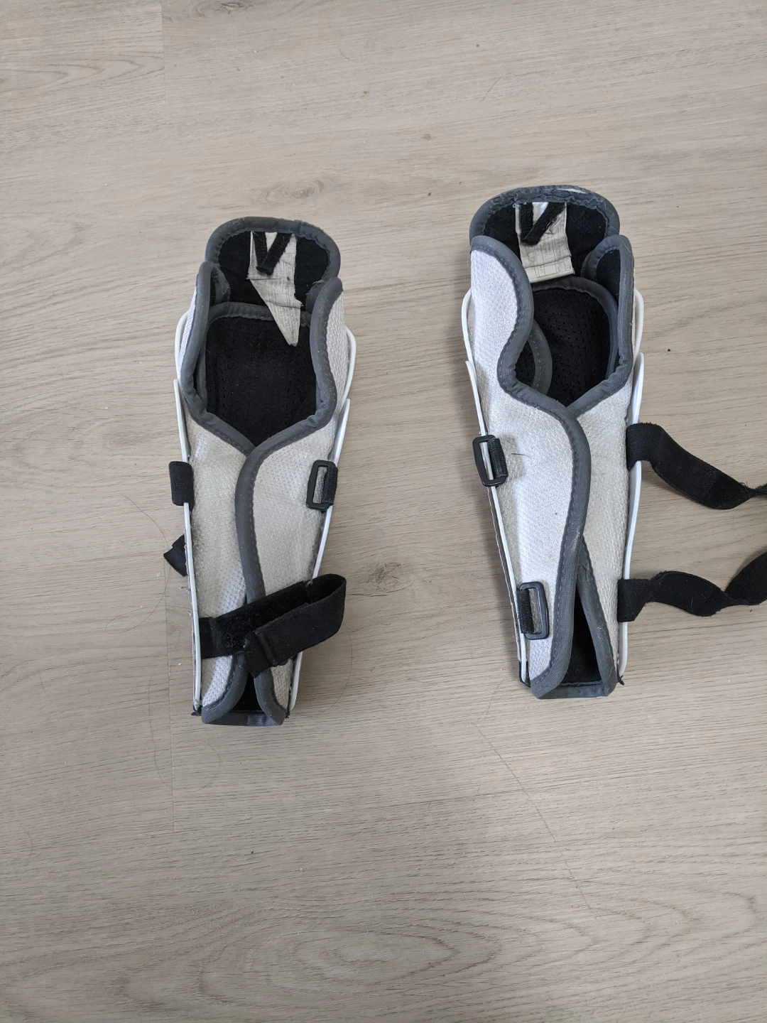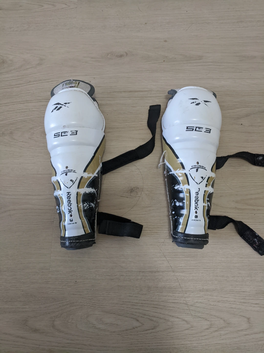 Pair of Reebok SC3 shin guards for hockey. They are white with gold and black accents. Measures 23 cm / 9".