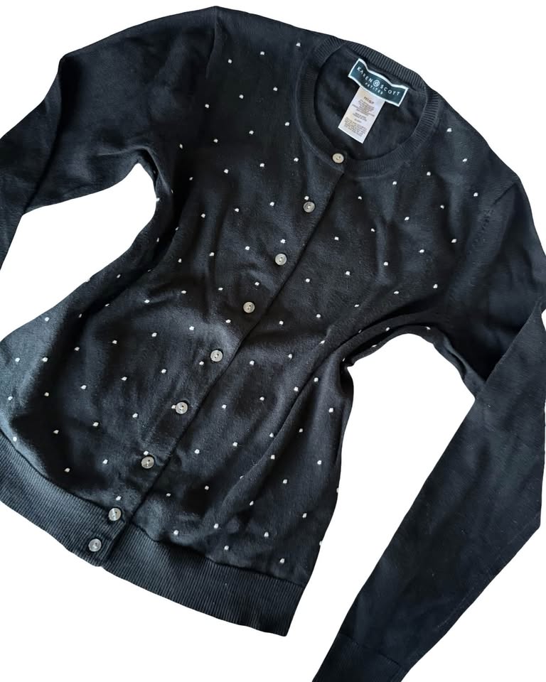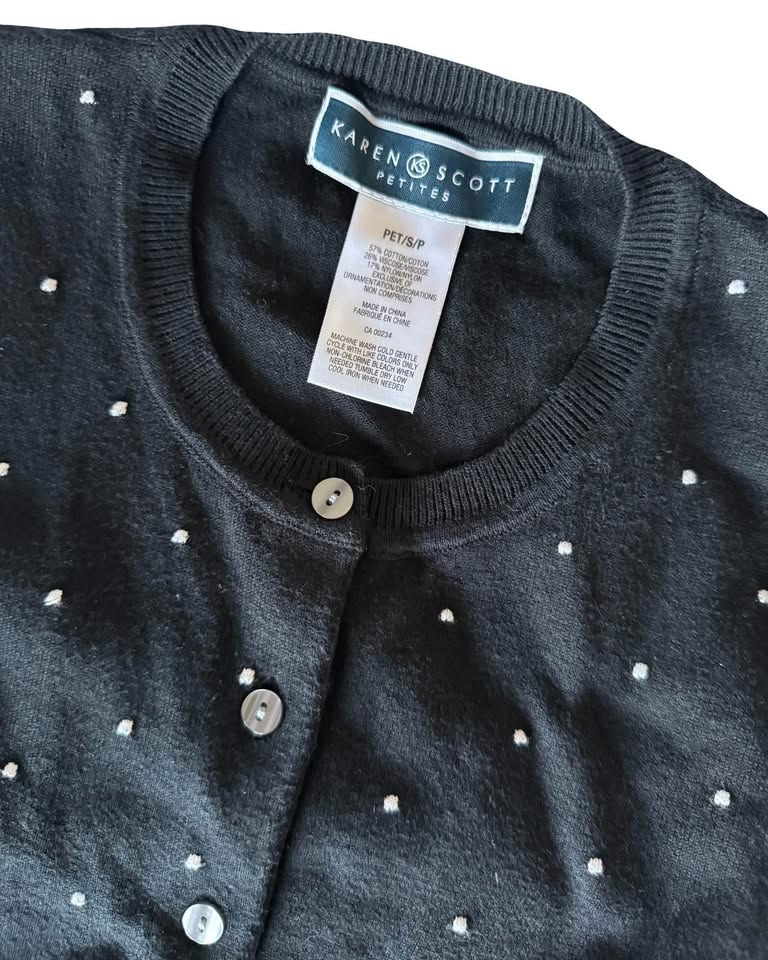 1 / 51 / 5Buy & SellBlack Cardigan with White Polka DotsBlack Cardigan with White Polka Dots$15Cute karen Scott black cardigan with white embroidered polka dots. Size smallWHERE TO MEETCheck LocationView MapSELLERJoanneChurchill Meadows34649 reviews0 chats·0 favorites·12 viewsSEND CHAT TO SELLERHi Joanne! I’m interested in your listing.Hi Joanne! I’m interested in your listing.Get the Karrot app to chatSign In to chat