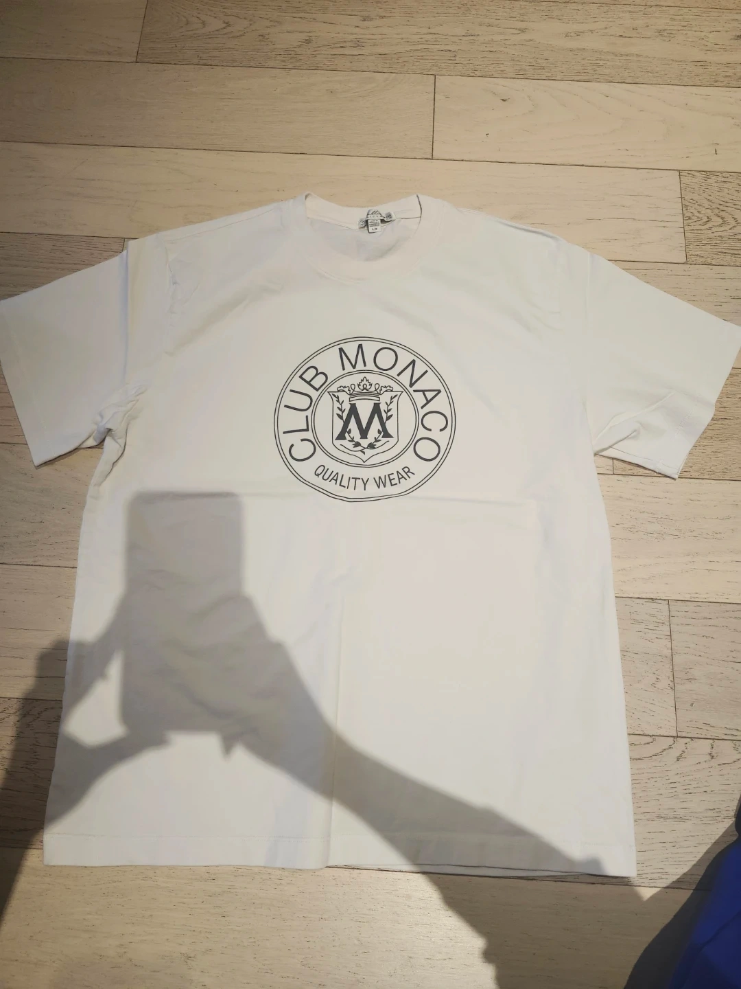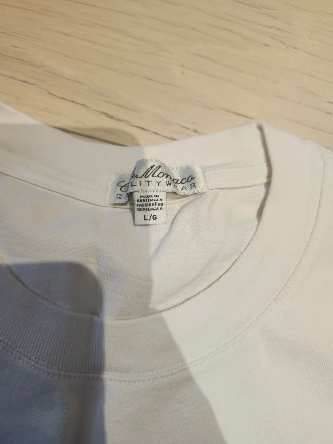 This is a white Club Monaco t-shirt. It's made in Guatemala. The material is cotton. It's a size L/G.