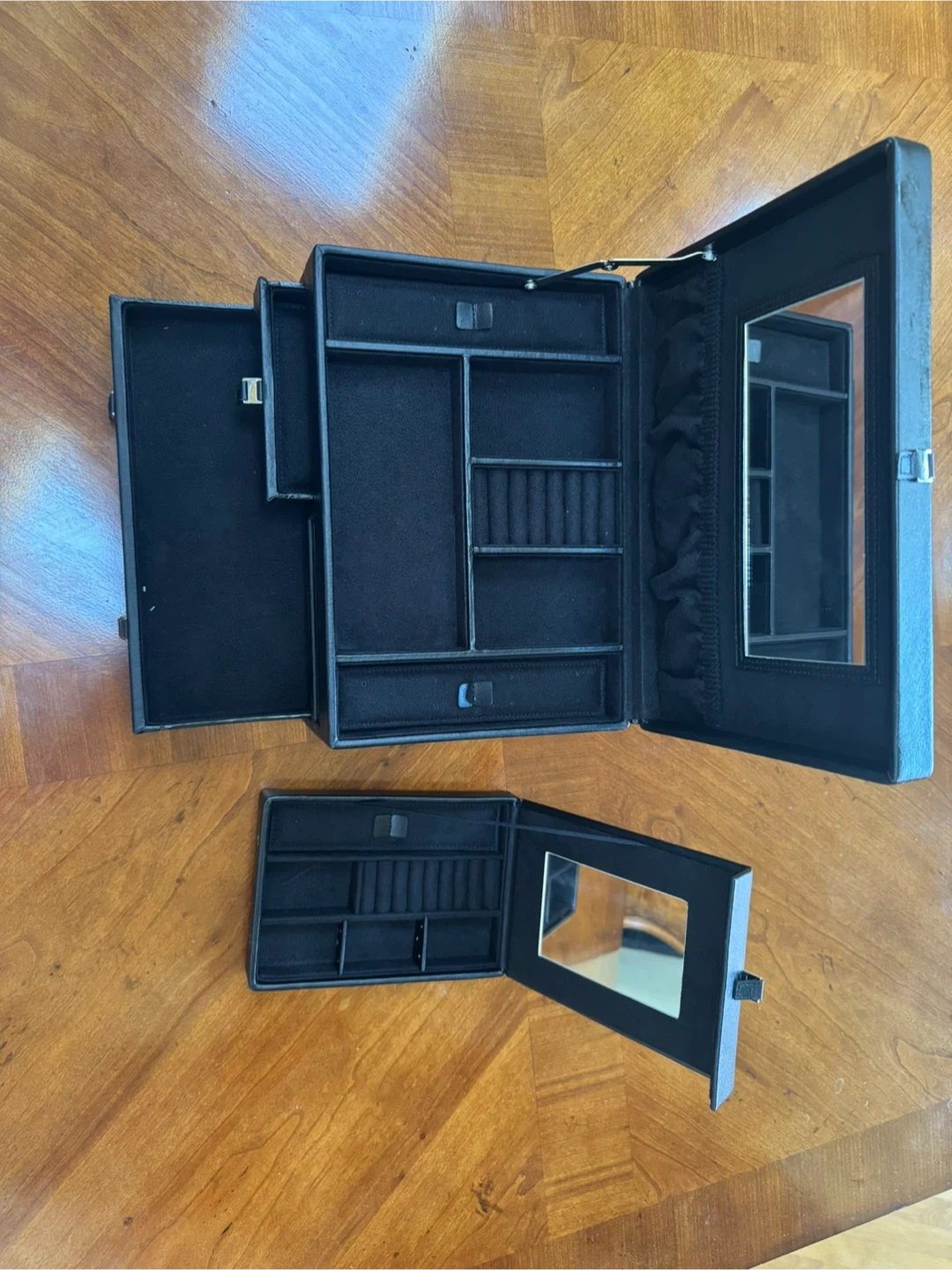 Selling a black faux leather jewelry box organizer that's perfect for keeping your precious items safe and tidy! It features multiple compartments and drawers to store rings, necklaces, earrings, and more. It has a sleek design and is in great condition! One removal compartment for travel. Original seller Ross-Simon