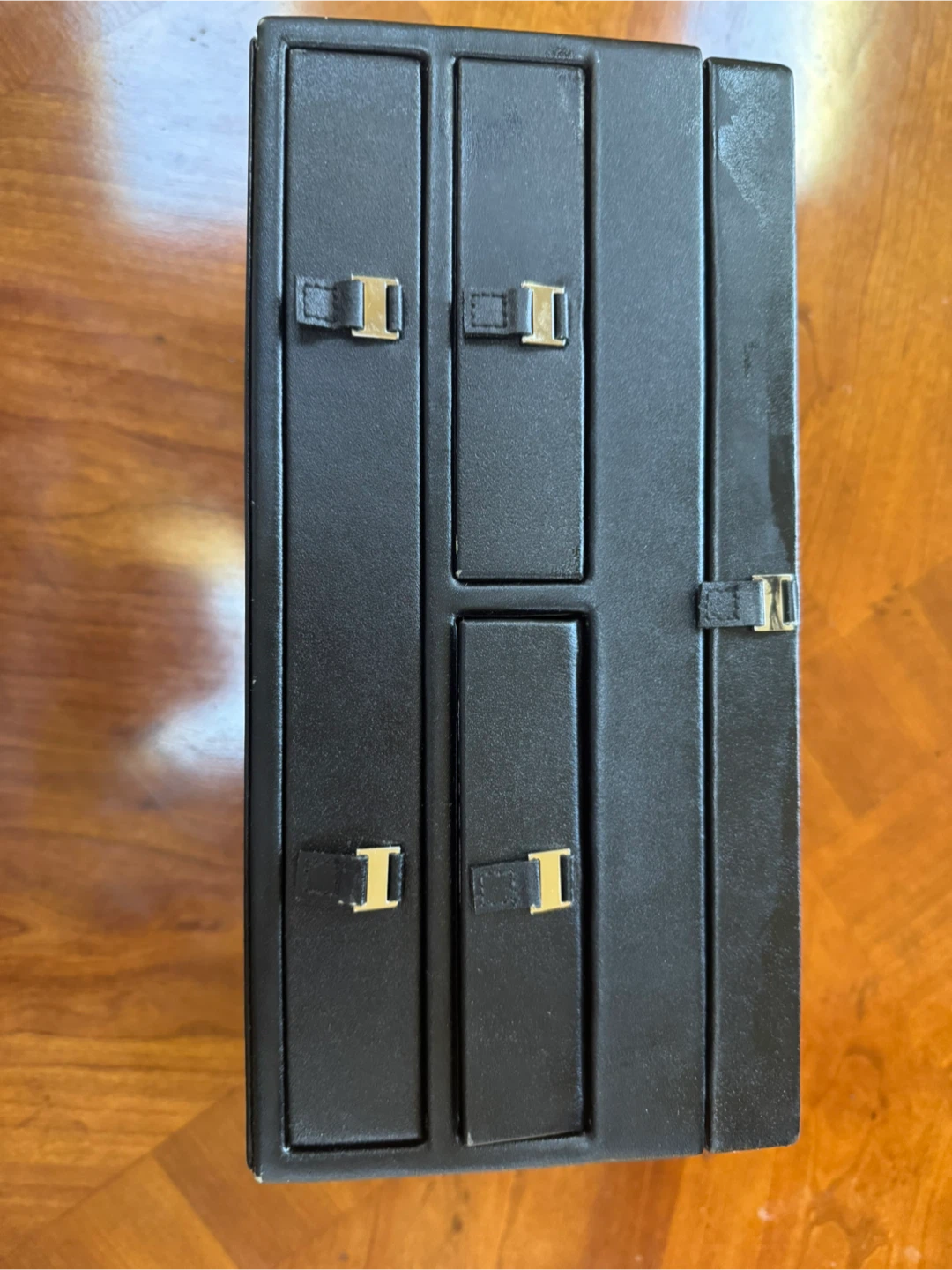 Selling a black faux leather jewelry box organizer that's perfect for keeping your precious items safe and tidy! It features multiple compartments and drawers to store rings, necklaces, earrings, and more. It has a sleek design and is in great condition! One removal compartment for travel. Original seller Ross-Simon