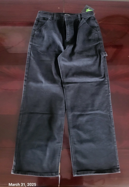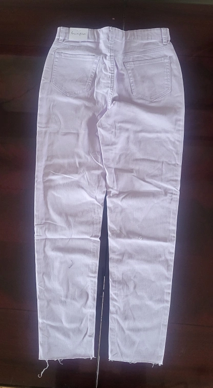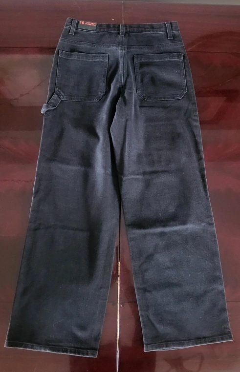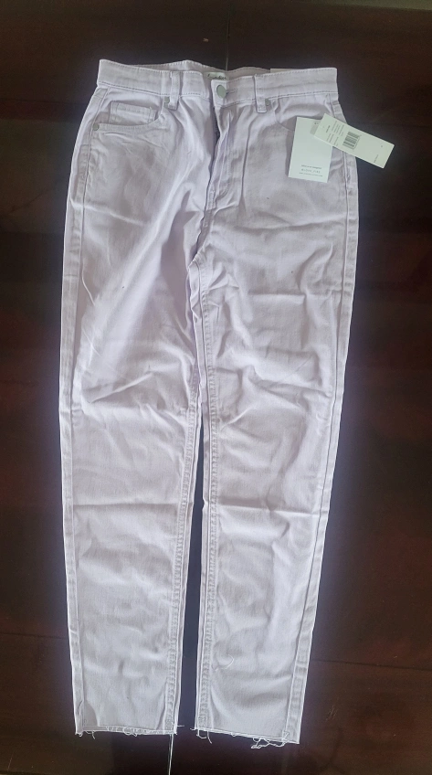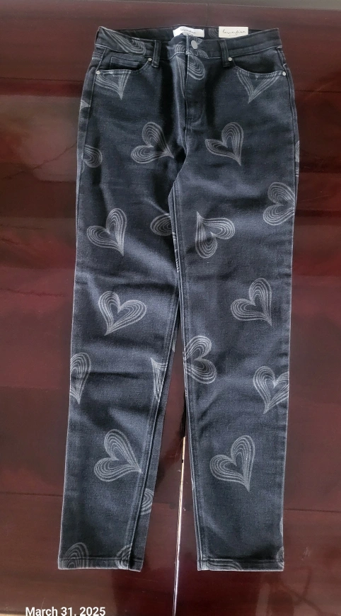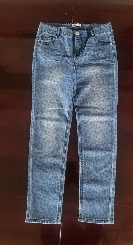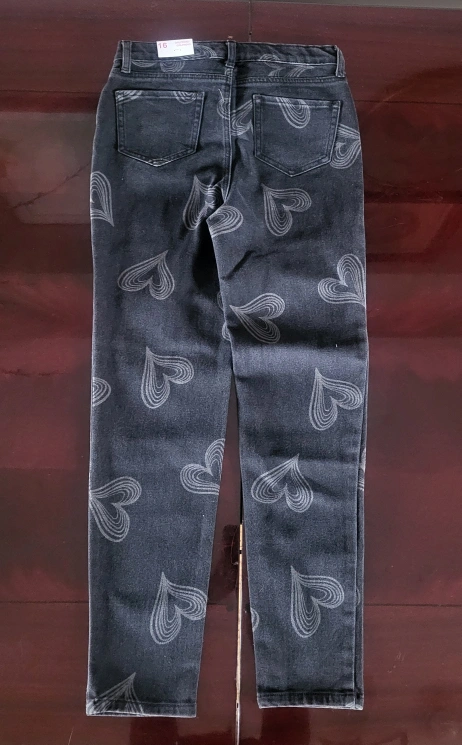 Four pairs of girls' size 16 jeans. Lavender, black with heart print, light blue leopard print, and black. Various styles and washes.