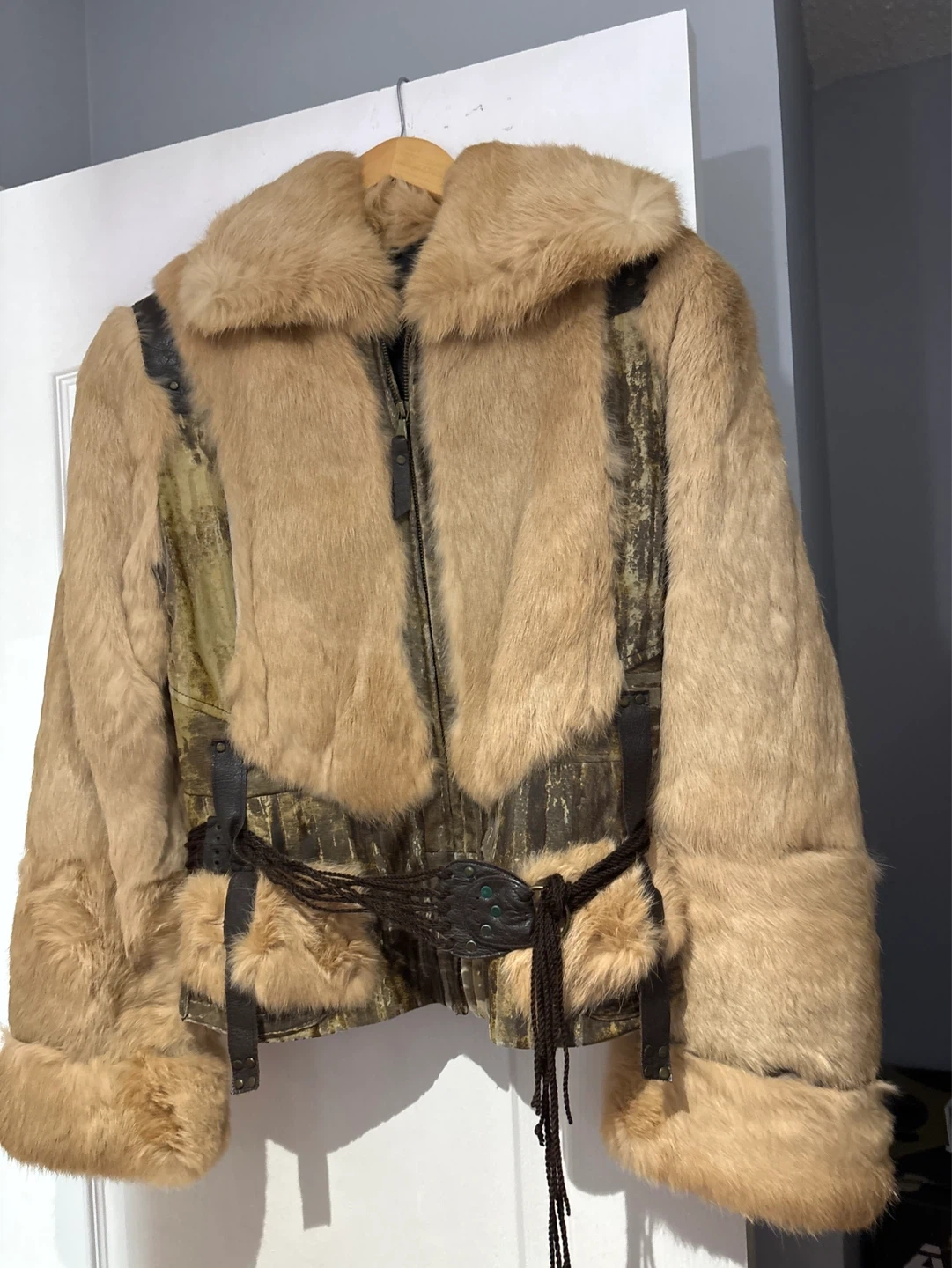 Stylish tan fur jacket with leather accents and a braided belt. Features a full zip front and fur collar. This unique jacket's material is a blend of fur and textured leather.