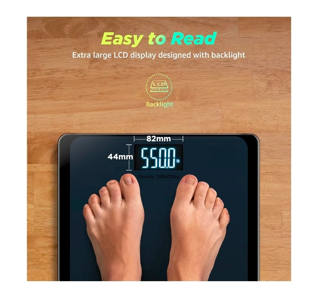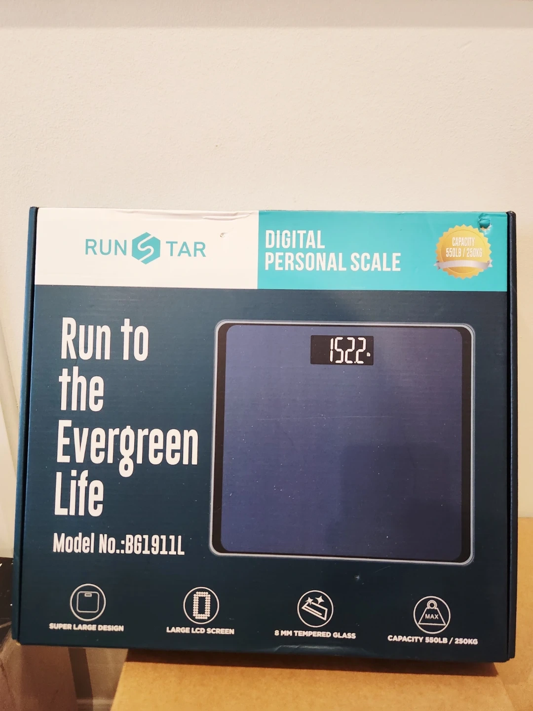 This is a Runstar digital personal scale. It has a super large design with a large LCD screen. The scale is made of 8 mm tempered glass and has a capacity of 550lb/250kg. It's easy to read with a backlight.