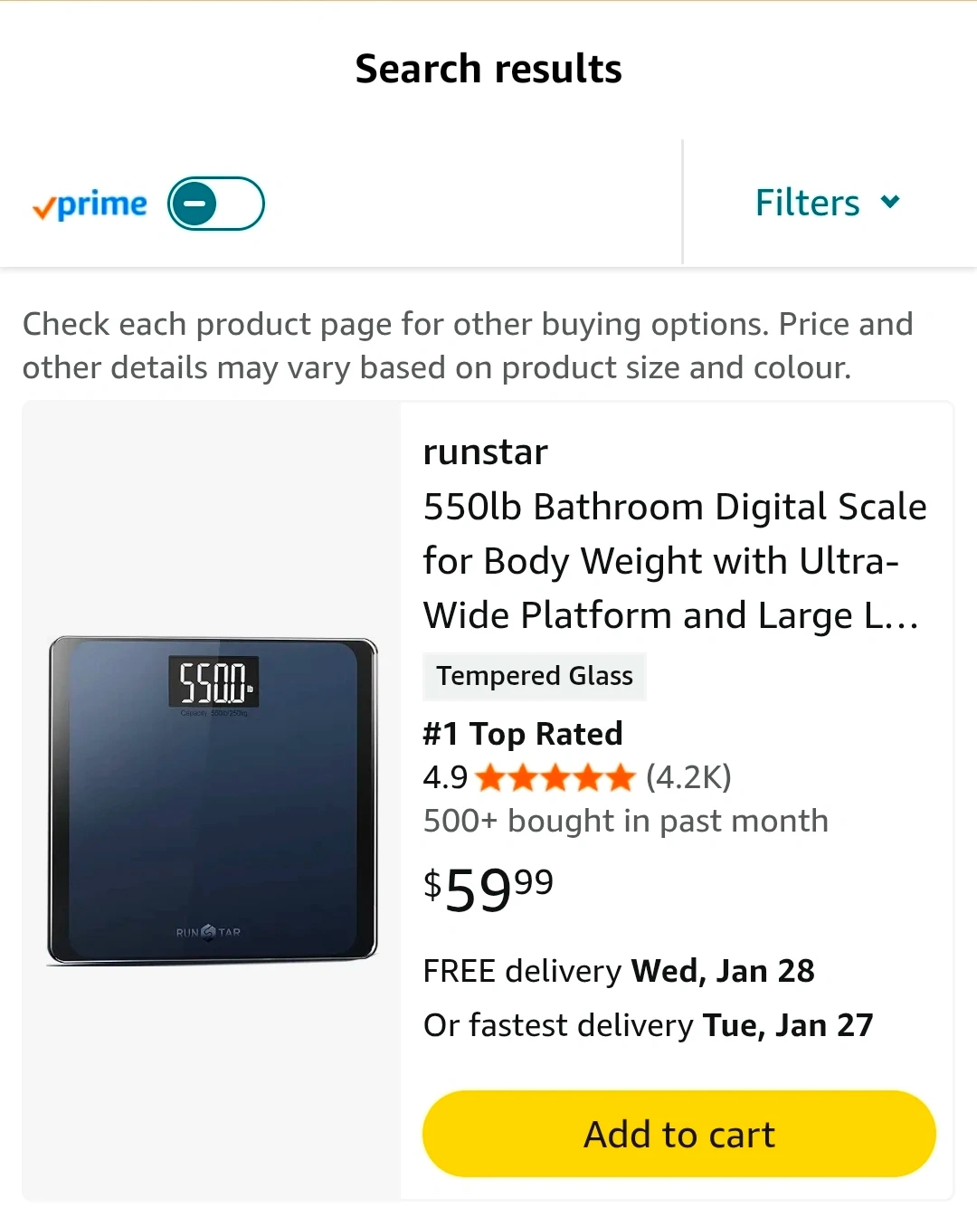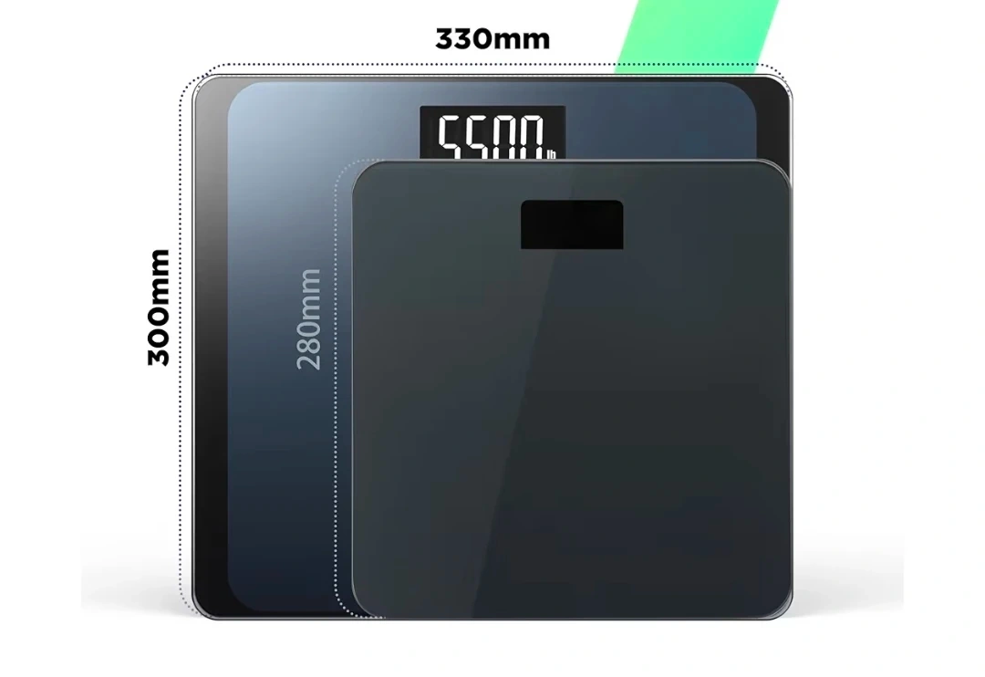 This is a Runstar digital personal scale. It has a super large design with a large LCD screen. The scale is made of 8 mm tempered glass and has a capacity of 550lb/250kg. It's easy to read with a backlight.