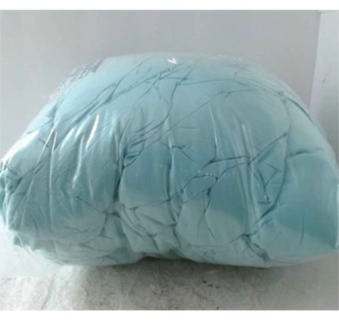This teal duvet cover set features a stylish ruffled design. It includes comforter and 2 pillowcases. Comes in a plastic bag, likely for protection during shipping or storage.